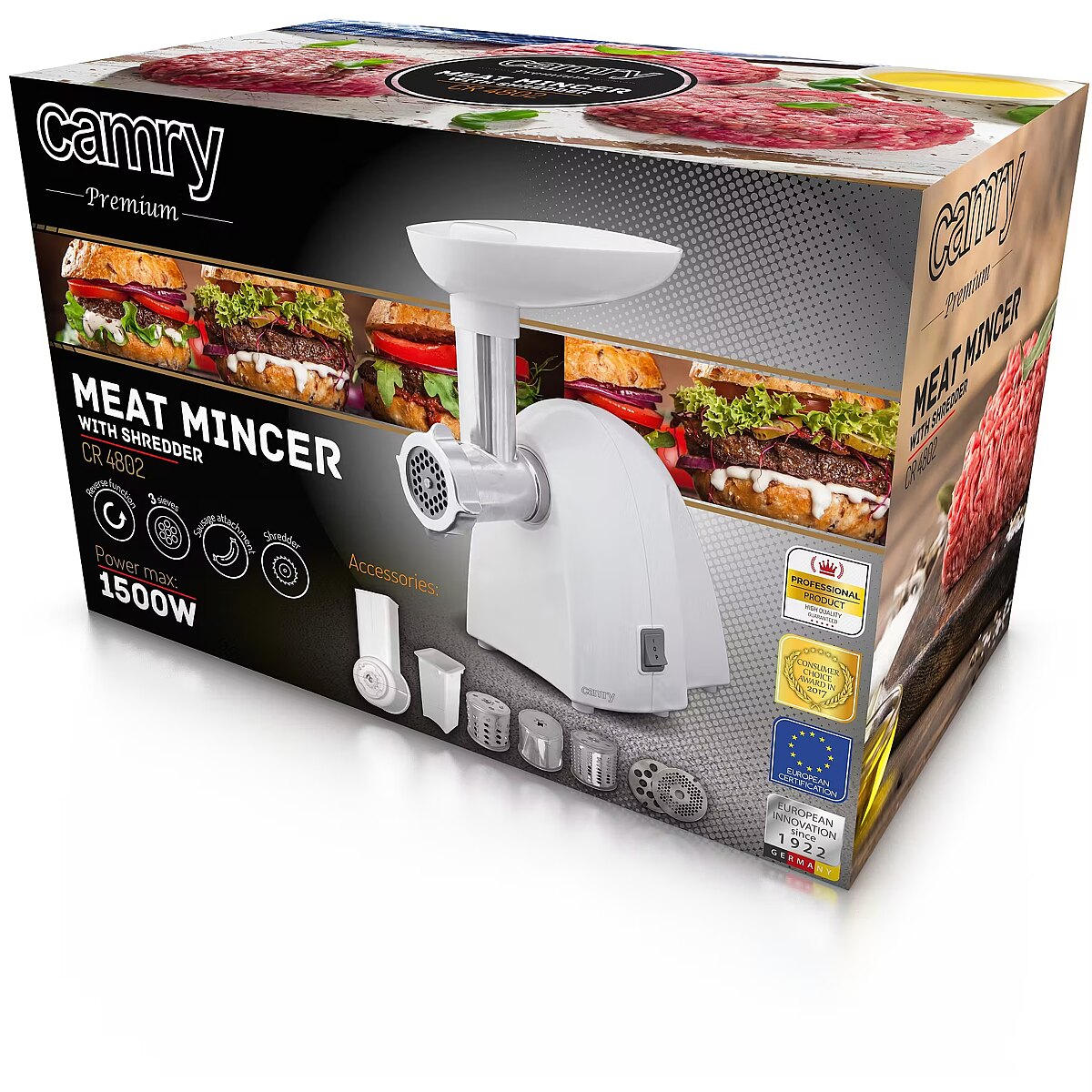 Name - Meat mincer | Camry | CR 4802 | White | 600-1500 W | Number of speeds 1 | Middle size sieve, mince sieve, poppy sieve, plunger, sausage filler, vegatable attachment.