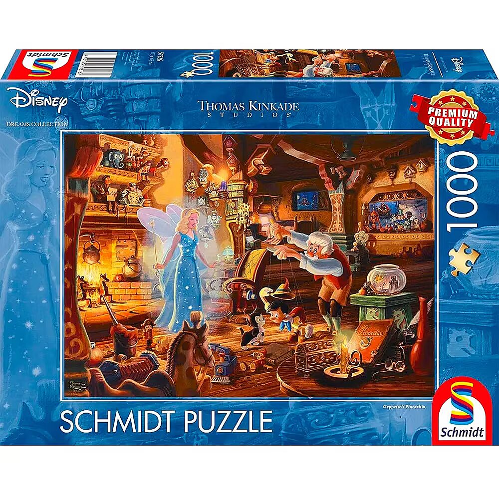Technical_details - The puzzles in the premium series from Schmidt Spiele impress with their wide variety of shapes, maximum accuracy of fit and a special matt varnish for mirror-free puzzling. This 1000 piece puzzle features a motif from Thomas Kinkade Studios: Disney Dreams Collection - Geppetto's Pinocchio. Item no.: 100010544 Kind of puzzle EAN 4001504575267 Manufacturer no. 57526 Parts 1000 Age recommendation from 12 years Target group: young people Warnings Warning: Not suitable for children under 36 months! Caution: Danger of suffocation due to small parts that can be swallowed! Note Warning! Plastic bags can be dangerous. Please keep away from children. Danger of suffocation! Further information The finished puzzle with 1000 pieces measures 69.3 x 49.3 centimeters