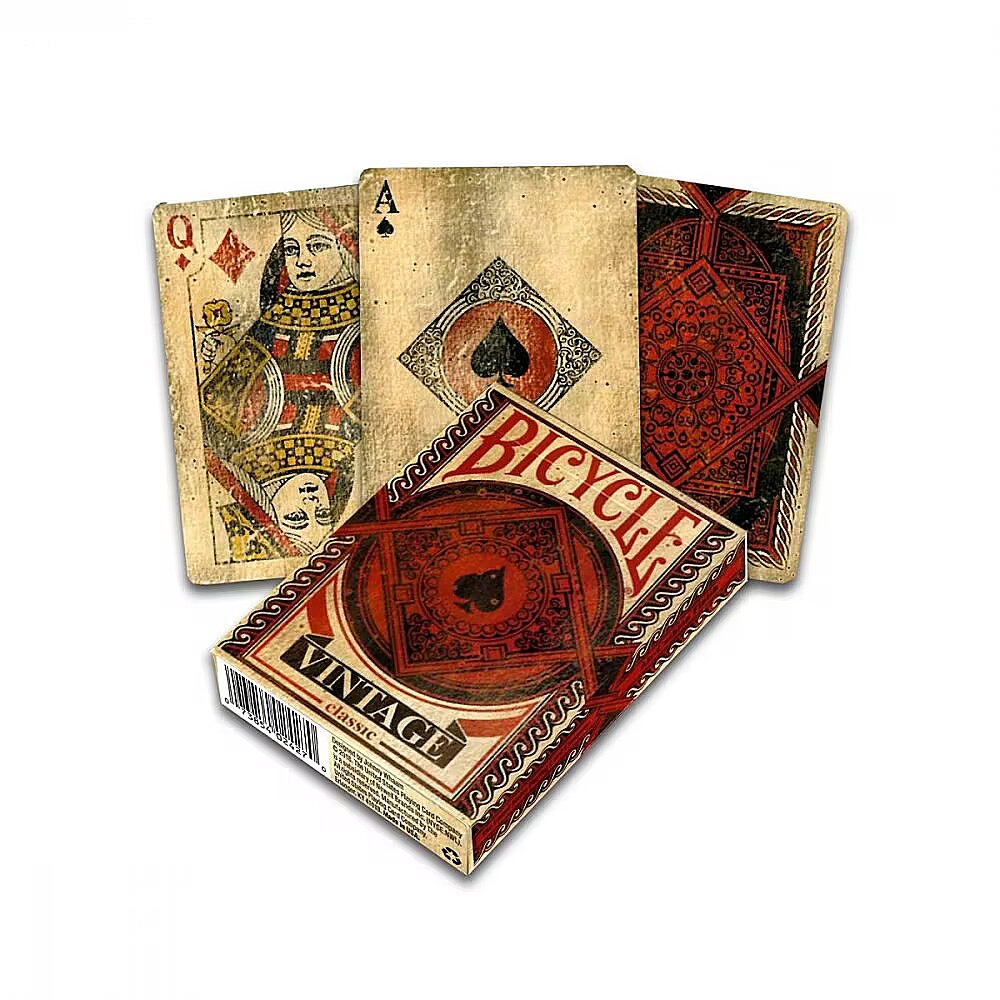 LongSummaryDescription - Bicycle Vintage. Number of cards: 56 pc(s), Product colour: Red, Yellow, Number of decks: 1 deck(s). Pallet gross weight: 633 kg, Products per shipping (inner) case: 6 pc(s), Shipping (inner) case length: 28.3 cm. Weight: 100 g, Width: 65 mm, Depth: 92 mm. Manufacturer: U. S. Playing Card Co.