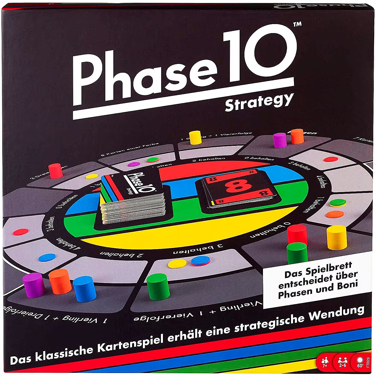 LongDesc - Travel the board and build the Phases you land on – every game is different! Phase 10™ Strategy is played in a series of rounds in which players take turns maneuvering pieces around the board so they can build combinations of cards known as "Phases." Players must plan their moves carefully because they can build a Phase only if their mover sits on its space, and they can build only one Phase per round. When someone "goes out" by playing a completed Phase and getting rid of their remaining cards, the round ends, all players receive new cards, and the next round begins. The race is on to finish your 10th Phase first! Each deck features "Wild" cards which add excitement and can help you get out of a sticky situation. Includes Game Board, 12 Movers, 60 Phase Markers, and 108 Cards. For 2-6 players, age 7 and up. Colors and decorations may vary.