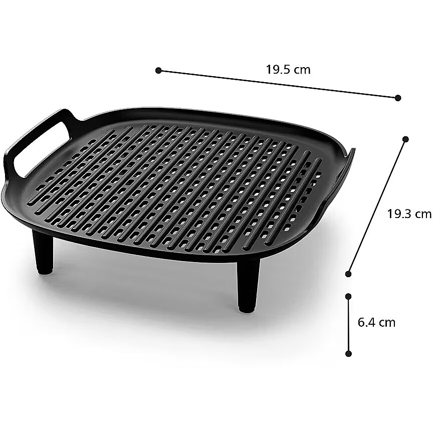 Summary - Philips Accessory for Airfryer 6.2 L. Type: Grill bottom & skewers, Brand compatibility: Philips, Compatibility: NA130, NA230, NA231, NA330, NA331, HD9270, HD9280. Width: 194 mm, Depth: 196 mm, Height: 64 mm. Package width: 198 mm, Package depth: 203 mm, Package height: 72 mm. Country of origin: China. Quantity per pack: 1 pc(s)
