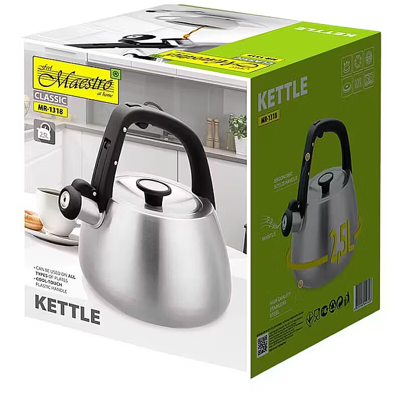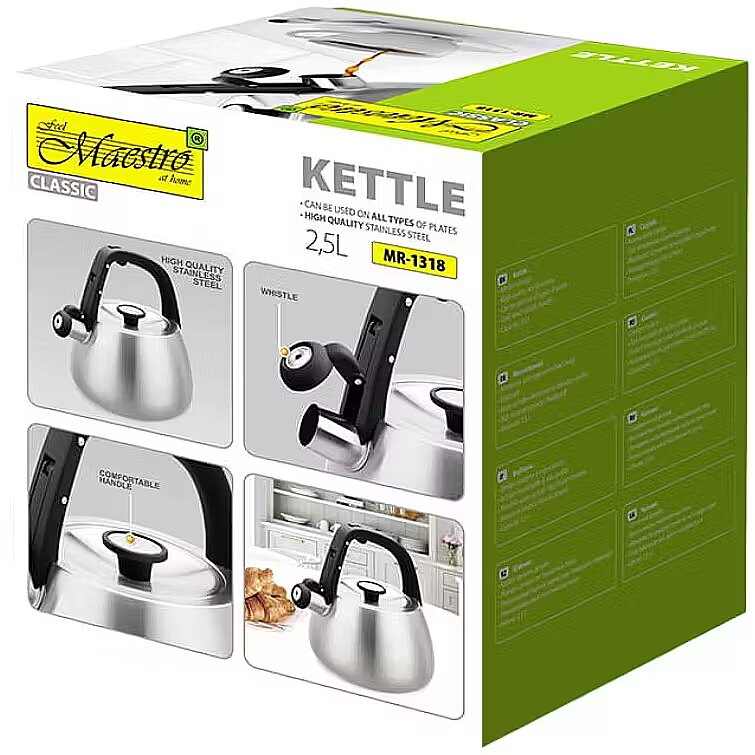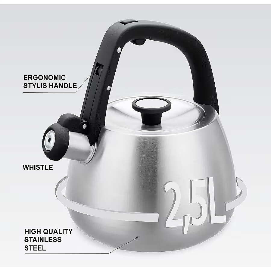 Description - Czajnik nieelektryczny Maestro MR-1318 to funkcjonalne urządzenie z gwizdkiem, które sprawdzi się w każdej kuchni. Wykonany z wysokiej jakości stali nierdzewnej, cechuje się solidnością oraz eleganckim wyglądem. Pojemność czajnika wynosi 2,5 litra, co umożliwia jednorazowe zagotowanie ilości wody, idealnej na herbatę lub kawę dla całej rodziny.