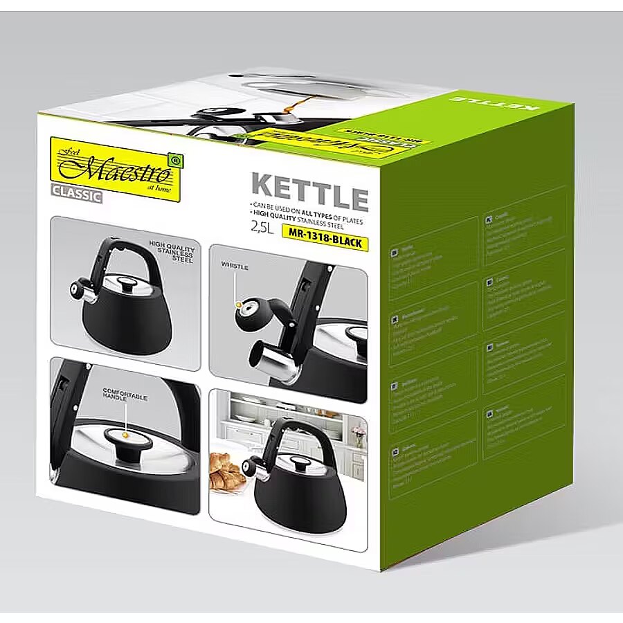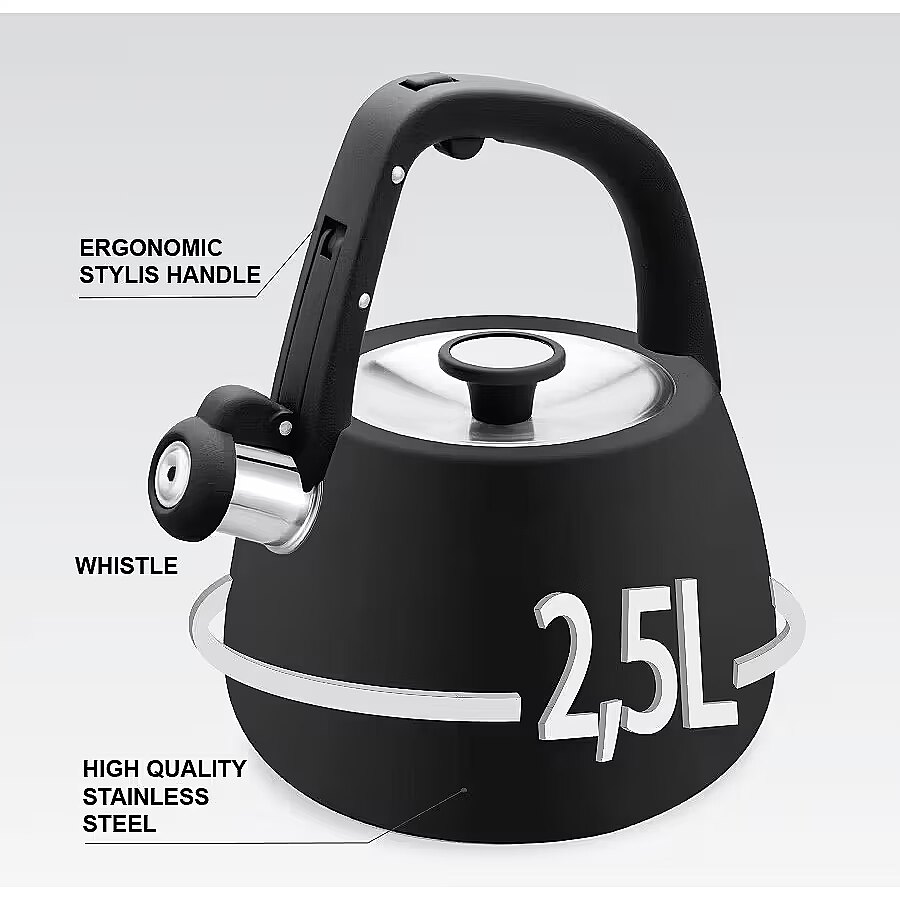 Description - Czajnik nieelektryczny Maestro MR-1318-BLACK to funkcjonalne urządzenie z gwizdkiem, które sprawdzi się w każdej kuchni. Wykonany z wysokiej jakości stali nierdzewnej, cechuje się solidnością oraz eleganckim wyglądem. Pojemność czajnika wynosi 2,5 litra, co umożliwia jednorazowe zagotowanie ilości wody, idealnej na herbatę lub kawę dla całej rodziny.