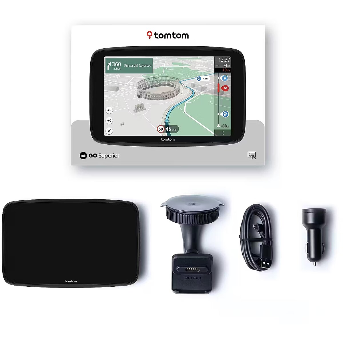See your route in ultra-high detail on a 6" touchscreen that boasts the best resolution on the market. And because TomTom GO Superior responds to voice commands, you can control it without taking your hands off the wheel. Plus, an easy-to-use click-and-drive mount keeps your sat nav secure and in position. Large 6" touchscreen Reliable TomTom world maps TomTom Traffic 2 years speed camera warnings 2 years of live fuel price information Excellent performance and responsiveness Fast map updates via Wi-Fi Improved visual cues (new!) Avoid environmental zones (new!) USB-C (new!) Active lane advice Effortless WiFi updates