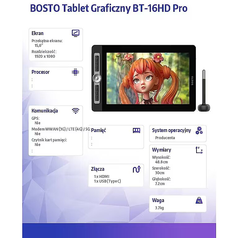 Description - A graphics tablet for everyone It doesn't matter whether you are a graphic designer or are just planning to become one. The BOSTO BT-16HD Pro tablet is a good choice for everyone, regardless of their skill level. The BOSTO BT-16HD Pro graphic tablet is a tablet with an LCD screen. This device is intended for creating digital graphics. It is also useful when studying, taking notes, giving presentations or lectures. As the name suggests, the tablet has a display. The effects of your work are visible at hand on the tablet and computer screen. The tablet needs constant connection to the computer to work. The BOSTO BT-16HD Pro tablet is distinguished by the presence of physical buttons that make performing repetitive tasks even easier. Physical buttons Physical buttons make it easy to access frequently used functions. Huge work surface The screen with a diagonal of 15.6, 16:9 aspect ratio and a working surface of 344.16 mm x 193.59 mm allows for comfortable work. 15.6 is the size of the most frequently purchased laptops. Display with FHD 1920 x 1080 px resolution The detail of the image will allow you to create precise graphics. 1920 x 1080 px is the typical resolution of laptop displays. Millions, 16.7 million to be precise. True, COLORS, but maybe someday? Who knows. The True Color standard and 8-bit color depth prevent banding. This means that the transitions between the displayed colors pass smoothly, without the impression of sharp and unsightly transitions. Gamut, i.e. a color range of 120% sRGB Color space coverage of 120% sRGB ensures very good color reproduction on devices and in software involved in graphics processing (e.g. monitor, printer, tablet, digital camera). Thanks to this, the tablet screen offers excellent color reproduction. Wide viewing angles Viewing angles: 178° (89°/89°) H (horizontal), 178° (89°/89°) V (vertical) allow for reliable reflection of contrast and colors regardless of the viewing angle of the screen. Compatibility The BOSTO BT-16HD Pro graphics tablet is compatible with the most popular Windows and macOS operating systems. With the tablet you can work with graphic software such as: Photoshop, CorelDRAW, GIMP, Krita, Sketchbook, MediBang Paint Pro etc. If your computer does not have a HDMI port, you must purchase an adapter. Ergonomics The anti-slip stand with an adjustable angle of inclination in the range of 0° - 60° ensures better drawing comfort and reduces the pain of the wrist after long hours of work, adapting to current needs. One cable does everything The cable combines USB and HDMI cables in one braid. No more tangled cables on your desk. Fewer tangled cables, more comfortable work. The screen is protected with tempered glass The glass pane protects the sensitive screen from damage, providing additional security. Design pleasing to the eye Minimalist and at the same time aesthetic design. Response to stylus pressure Thanks to 8192 LPS (levels pressure sensitivity), the tablet dynamically responds to pen pressure. This changes the thickness of the brush. Stronger pressure, thicker line. This, combined with 5080 LPI (lines per inch) ensures the most natural drawing experience possible, reducing drawing fatigue while ensuring smooth and precise work. Reporting speed Reporting speed > 220 RPS (reports per second) allows the computer to see the position of the pen in a fraction of a second. This allows you to draw lines without delays. Large stylus tilt range The screen responds to the stylus at an angle of up to 60°. Thanks to this, the pen can be adjusted according to your habits for more comfortable work. BOSTO W09 fountain pen Wireless, battery-free, passive Pen resolution: 5080 LPI (0.005 mm/point) Pressure Levels: 8192 LPS Reporting speed: > 220 RPS (reports/sec) Precision: 0.25 mm Detection height: 15 mm