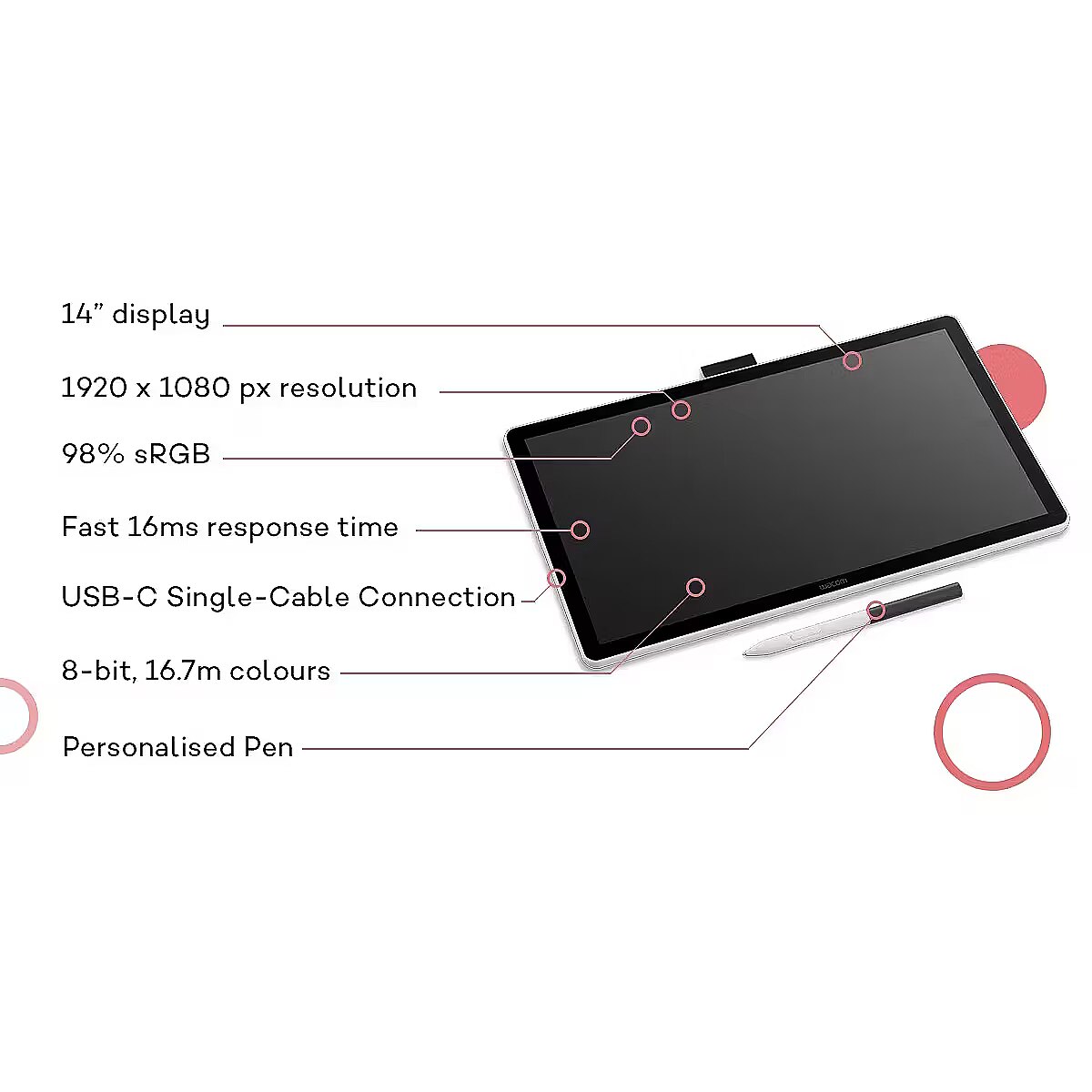 Uus Wacom One pakub avarat 14-tollist Full HD ekraani, mis annab rohkem ruumi digitaalset kunsti, fototöötlust ja märkmeid ellu viia. Selle ekraan vähendab parallaksi ja muudab pliiatsi juhtimise täpsemaks. Matt, peegeldust vähendav ja sõrmejäljekindel pind pakub loomulikku, paberilaadset tõmmet igal joonel. Lihtne seadistamine, sujuv töövoog