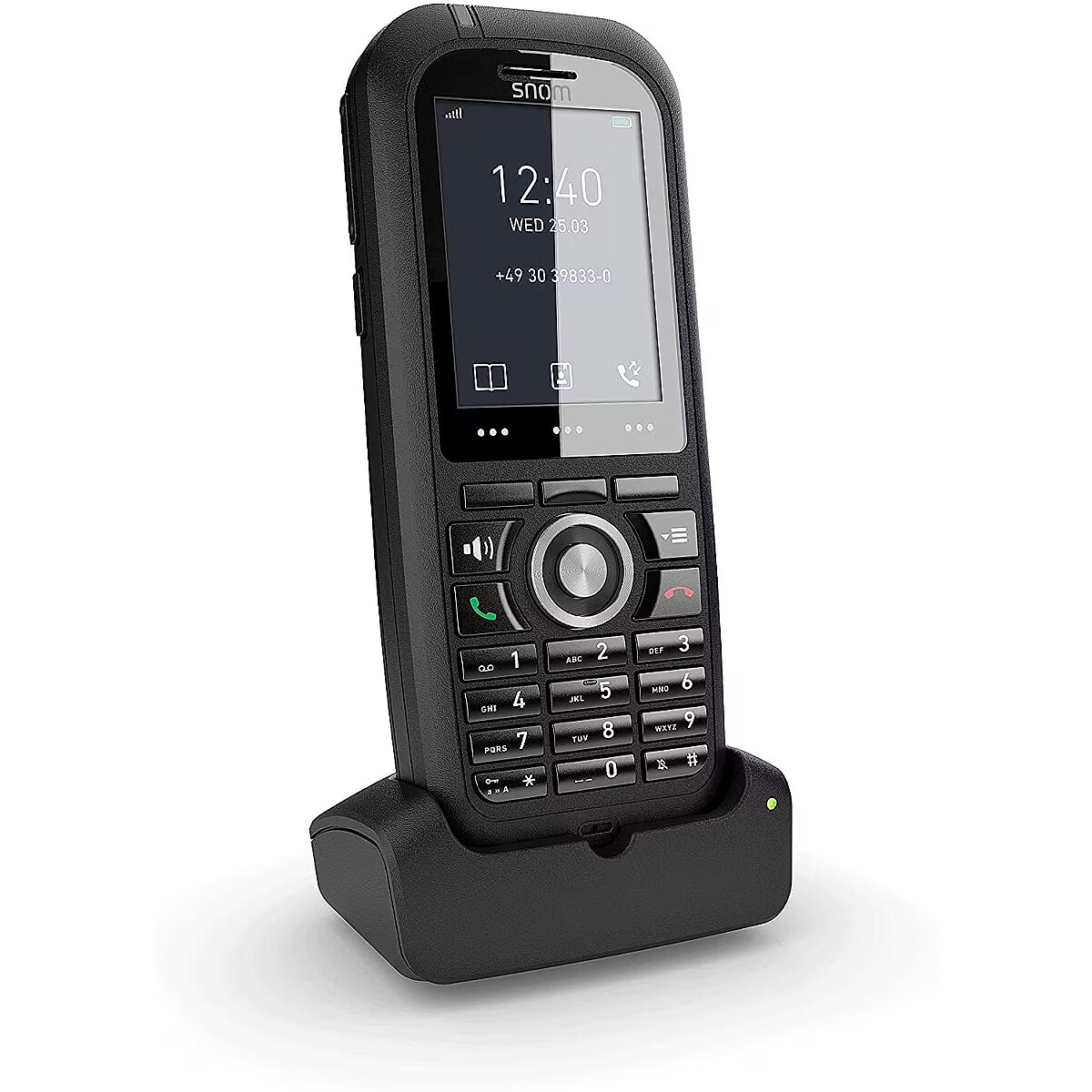Technical_details - M80 DECT, analogue telephone The snom M80 DECT is an extremely robust, analogue DECT telephone for indoor and outdoor use. Thanks to the IP65 protection class and the MIL-STD 810G certification, the phone withstands dust and splashing water as well as rain, falls and bumps. On the bright color display you can navigate through all menus and recognize incoming calls (CLIP). The integrated batteries are sufficient for up to 12 hours of talk time and even last up to 200 hours in standby. Thanks to integrated Bluetooth and HD audio, the call can be transmitted to external speakers in crystal-clear quality. Device type: analog phone Color: Black EAN: 4260059582797 Manufacturer No.: 4424 Connection Type: Analogue Storage: Phone Book Entries | 250 Storage: Redials | Yes Connection: Bluetooth | Yes Handset: Connection | DECT, cordless Handset: Range | In buildings | 50 meters Handset: Range | Outdoors | 300 meters Handset: Battery life | Standby | 200 hours Handset: Battery life | talk time | 17 hours Display: 240 x 320 pixels, TFT color display Displays: call duration, date and time, charging status, signal strength Functions: 9 speed dials, speakerphone, caller ID (CLIP), menu-driven user guidance, alarm function, three-party conference, hearing aid compatible, mute, queue, IP65 protection class, HD audio, call waiting Dimensions: Width: 48mm x Height: 122mm x Depth/Length: 22mm
