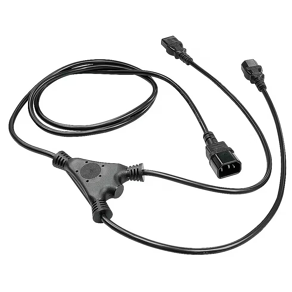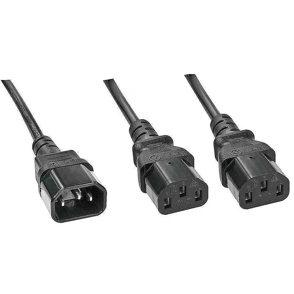 Description - 1m C14 to 2 x C13 Mains Cable Connector A: IEC C14 Connector B: 2 x IEC C13 Cable type: H05-VVF 3G * 0.75 mm² Colour: Black 10 year warranty
