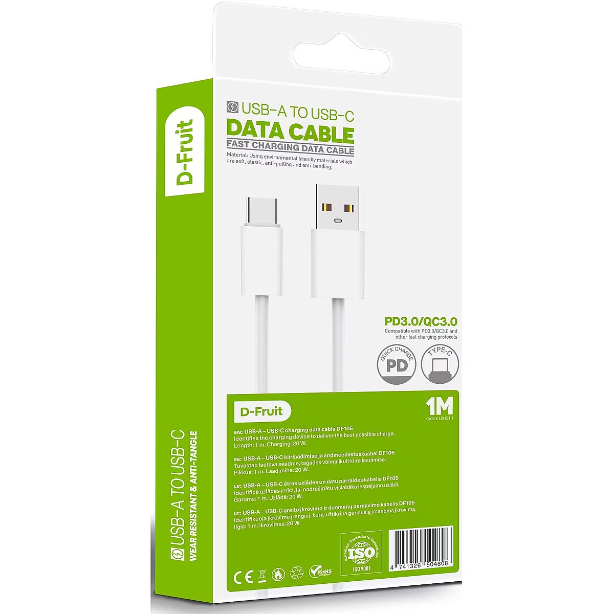 description_en - The D-Fruit DF106 USB-A cable connects your iPhone, iPad, or iPod with a Lightning connection to a computer's USB port for synchronization and charging, or for charging from a wall socket with an Apple USB charging adapter. The cable is wear-resistant and does not get tangled. USB-A - Lightning cable Suitable for both charging and data transfer Supports fast charging Power: up to 25 W Length: 100 cm