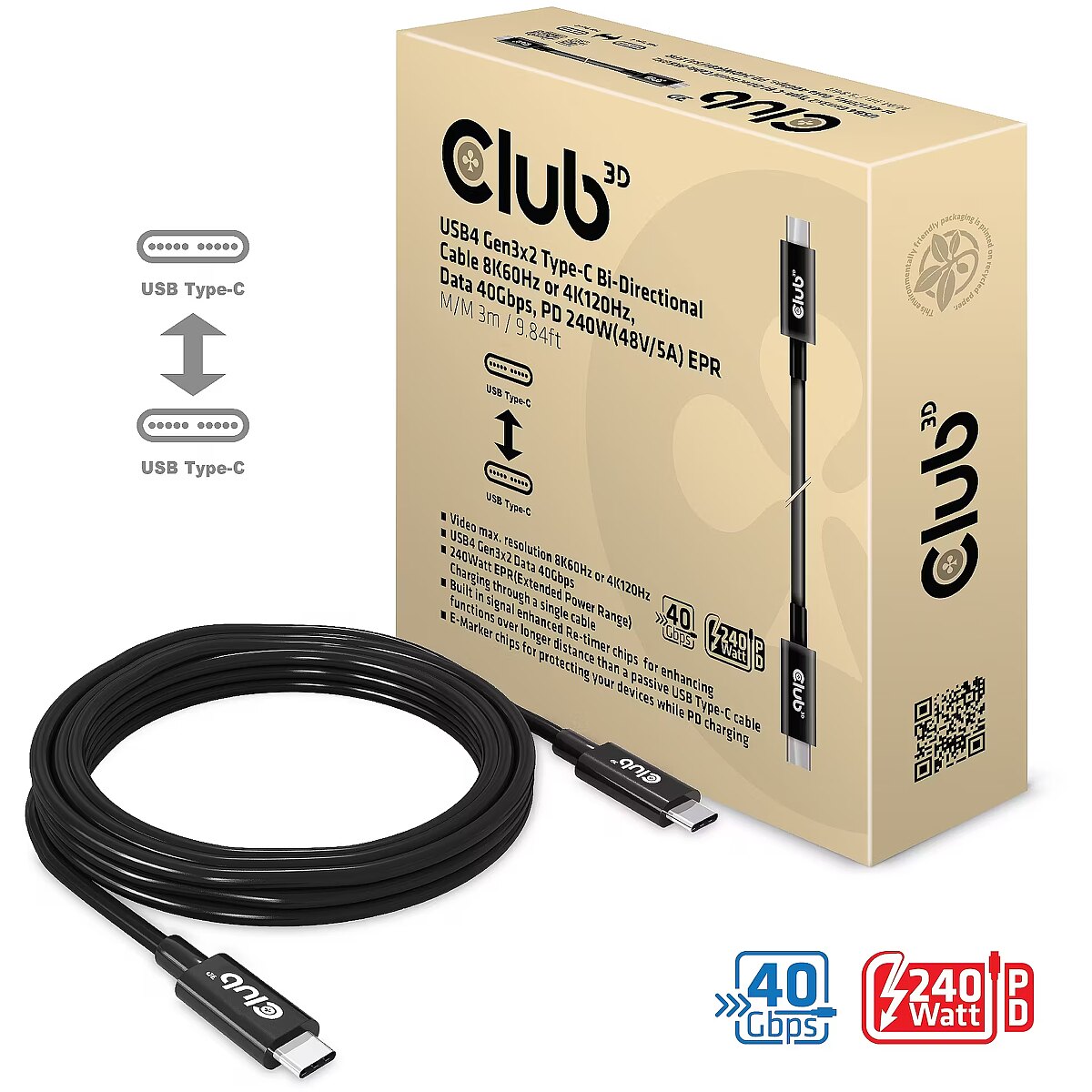 LongSummaryDescription - CLUB3D USB4 Gen3x2 Type-C Bi-Directional Cable 8K60Hz or 4K120Hz, Data 40Gbps, PD 240W(48V/5A) EPR M/M 3m / 9.84ft. Cable length: 3 m. Connector 1: USB C, Connector 2: USB C, USB version: USB4 Gen 3x2, Maximum data transfer rate: 40 Gbit/s, Product colour: Black