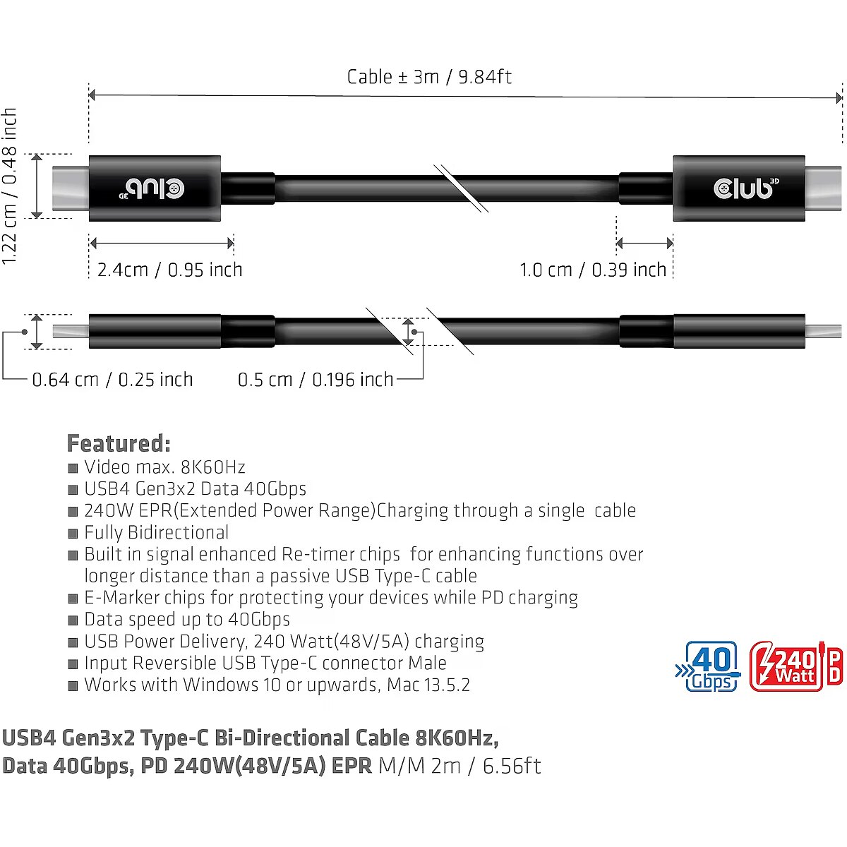 URL - https://www.club-3d.com/en/detail/2645/usb4_gen3x2_type_c_bi_directional_cable_8k60hz_or_4k120hz_data_40gbps_pd_240w(48v-5a)_epr_m-m_3m_-_9.84ft/
