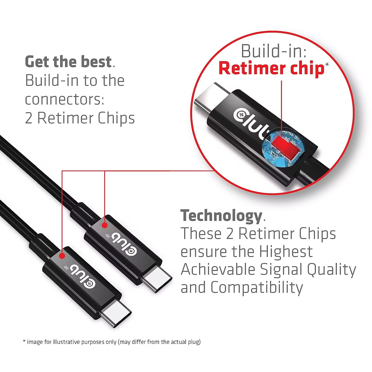 Description - USB4 Gen3x2 Type-C Bi-Directional Cable 8K60Hz or 4K120Hz, Data 40Gbps, PD 240W(48V/5A) EPR M/M 3m / 9.84ft The Club 3D CAC-1579 USB4 Gen3x2 Type-C Bi-Directional Cable 8K60Hz or 4K120Hz, Data 40Gbps, PD 240W(48V/5A) EPR M/M 3m / 9.84ft connects your Notebook, Tablet or Phone with USB4 Type-C output to your favorite existing Peripherals, Accessories and Chargers. It enables Video,Data and Power over a single cable and both ways. Built in signal enhanced Re-timer chips, for enhancing functions over longer distance than a passive USB Type-C cable, together with the E-marker chips on both ends of the cable, provide this cable with support for USB4 Gen3x2 Type-C Bi-Directional Video 8K60Hz or 4K120Hz, Data 40Gbps, PD 240W(48V/5A) EPR M/M over a length of 3m / 9.84ft for Downstream charging or powering your Notebook, Tablet or Smartphone.