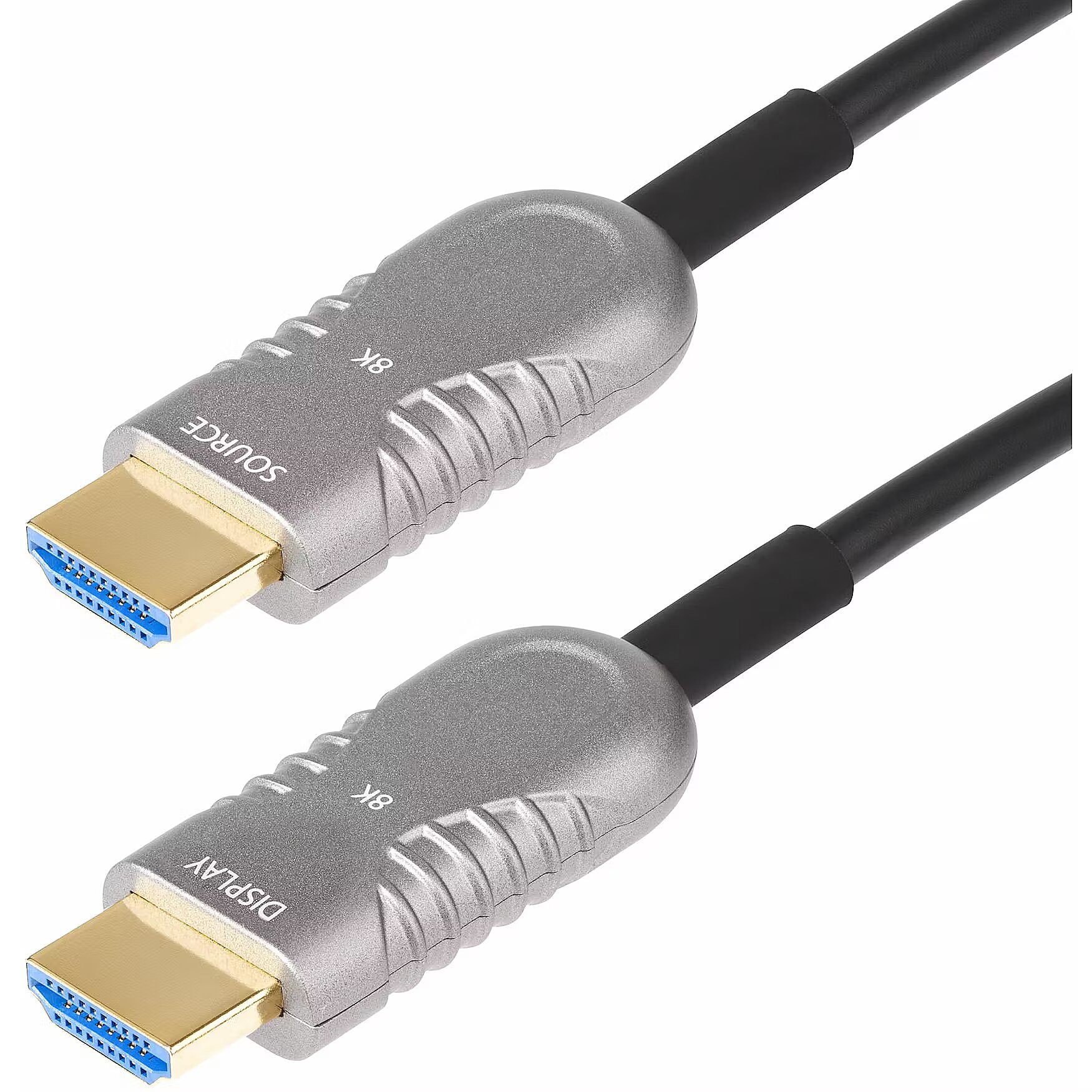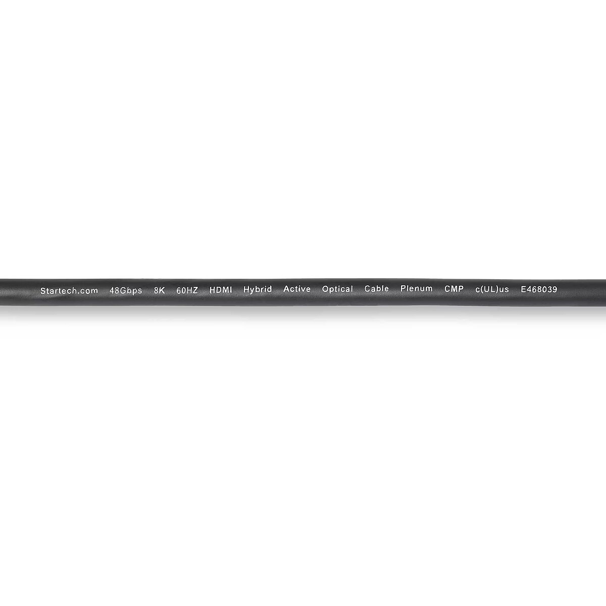LongDesc - Reliably connect high-bandwidth HDMI 2.1 devices through plenum spacesRoute this Ultra High Speed HDMI 2.1 Hybrid Active Optical Cable (AOC) through office plenum spaces for long distance transmission of 8K 60Hz video and high quality audio.Hybrid AOC ConstructionThe HDMI 2.1 AOC incorporates a hybrid construction consisting of fiber optic cores and copper conductors. This enables the offloading of low-bandwidth signals (EDID/HDCP/eARC) to maintain high-bandwidth transmission of 8K 60Hz video over fiber. The fiber optic inner cores and shielded copper conductors greatly reduce EMI for optimal signal quality across longer distances.Full-Featured HDMI 2.1The 8K HDMI Fiber Optic Cable supports full HDMI 2.1 specifications:• High Bit Rate 3 (HBR3) supports up to 48Gbps bandwidth for higher refresh rates• High Dynamic Range (HDR10+) with 12-bit processing for higher contrast ratio and vibrant, cinematic picture quality• Enhanced Audio Return Channel (eARC) for uncompressed 7.1 and 32-channel audio• Display Stream Compression 1.2a (DSC) for maximum resolution output• Forward Error Correction to manage data transmission errors• High-Bandwidth Digital Content Protection (HDCP 2.3) for a secure connection between source and displayFlexible Plenum-Rated CablingThis Plenum-Rated HDMI 2.1 Cable features a CMP-rated cable jacket with low-smoke and flame characteristics. It is ideal for use in plenum spaces in buildings (e.g., ceilings and in-wall installations). The optical fiber core is reinforced with Aramid strands for tensile strength, and is rated to withstand over 6,000 bending cycles at 120 degrees. This protects the cable from damage when routing through tight spaces requiring multiple bends.The 4.6mm (0.18in) cable outer diameter is flexible and slimmer than typical passive HDMI cables, making it suitable for installation in space-constrained environments.Please Note : This cable is unidirectional and must be installed in a specific direction. Please refer to the SOURCE and DISPLAY labels on the HDMI connectors to ensure that each end corresponds with the correct hardware.The StarTech.com Advantage