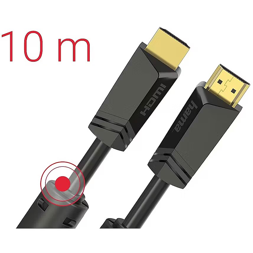 LongSummaryDescription - Hama 00205009. Cable length: 10 m, Connector 1: HDMI Type A (Standard), Connector 1 gender: Male, Connector 2: HDMI Type A (Standard), Connector 2 gender: Male, Connector contacts plating: Gold, 3D, Data transfer rate: 18 Gbit/s, Audio Return Channel (ARC), Product colour: Black