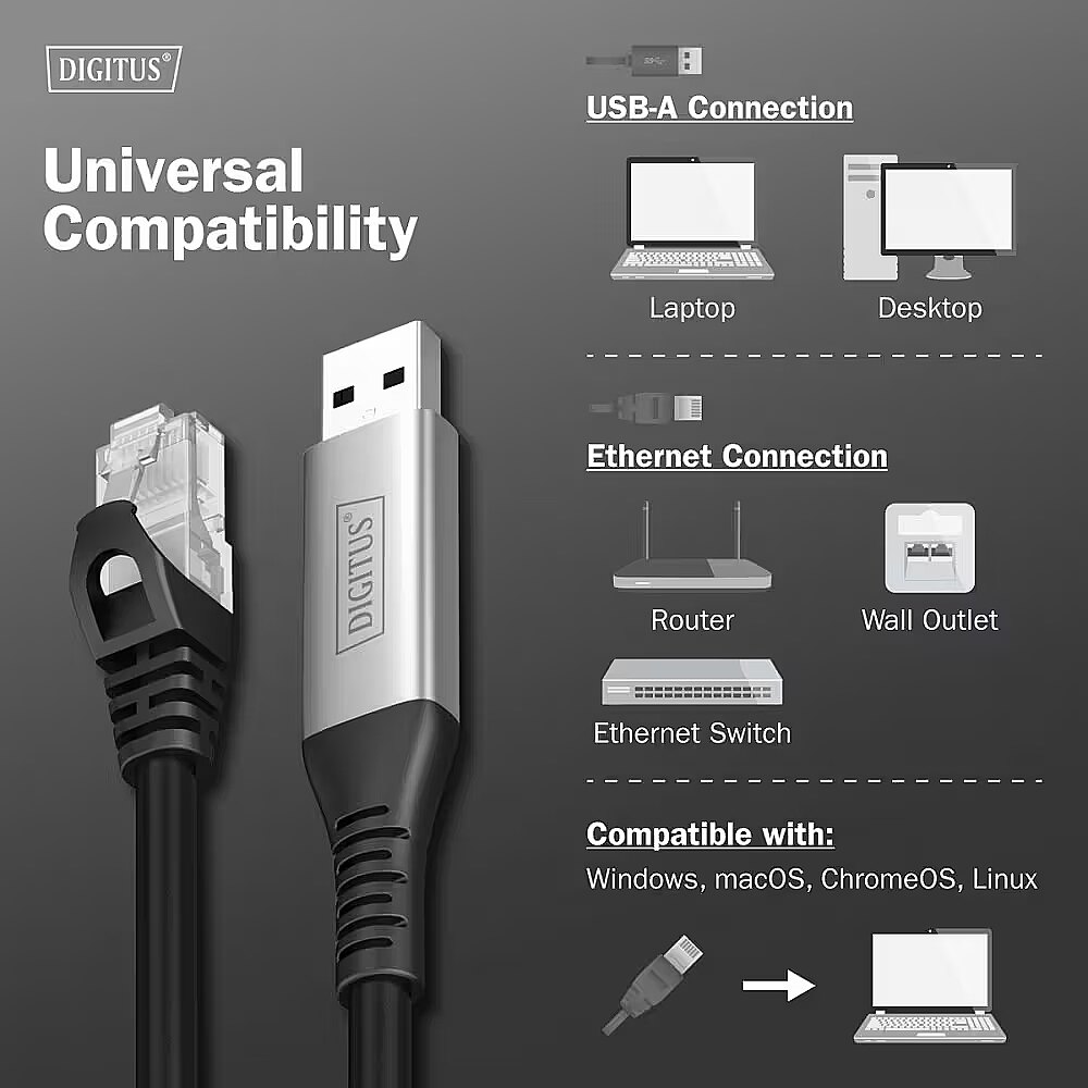 Description - Fast, reliable USB-A network connection - perfect for modern devices without an Ethernet port. Enjoy gigabit speeds and hassle-free plug-and-play installation. The USB-to-RJ45 cable allows easy connection of a USB-A device to a wired network, providing a stable and fast Gigabit Ethernet connection. It replaces conventional Ethernet adapters, offering a compact, space-saving solution without extra devices. Ideal for laptops and peripherals without built-in LAN. Experience fast and reliable internet - perfect for video streaming, online meetings, or data-heavy applications. With Wake-On-LAN and RealWoW! (Wake-On-WAN) support, you can even remotely power on your device. The LSZH (Low Smoke Zero Halogen) housing minimizes smoke and toxic fumes in case of fire, making it suitable for public or sensitive installations. Plug-and-play installation ensures immediate use, fully compatible with macOS and Windows - no additional drivers or external power required. A versatile and safe solution for any setup! Key Features: Fast wired Gigabit internet: up to 1 Gbit/s Broad macOS and Windows compatibility: works seamlessly with all USB-A laptops and peripherals without a LAN port Remote access support: Wake-On-LAN and RealWoW! for convenient device control Safe for sensitive installations: LSZH coating minimizes smoke and eliminates toxic fumes Easy installation: plug-and-play Durable design: high-quality aluminum housing
