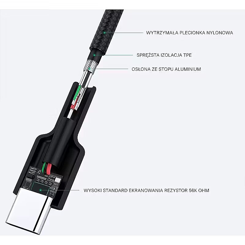 Other features - Materiał: plecionka nylonowa Kable spełniają wymagania Power Delivery, Quick Charge 4.0 / 3.0 / 2.0 / 1.0, AiPower, Fast Charge itp. Transfer danych do 5 Gbps Natężenie: do 3A Napięcie: do 20V Moc: do 60W Pozłacane złącza Wielowarstwowe ekranowanie