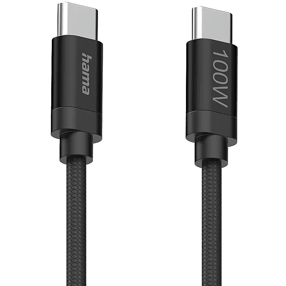 MediumDescription EN - The Hama Fabric USB-C to USB-C charging cable delivers up to 100W of power for extremely fast charging of smartphones, tablets and even high-performance laptops. It supports Power Delivery 3.1 and Quick Charge™ 4+, offers data transfer speeds up to 480 Mbit/s and features a durable braided nylon sheath with aluminium connectors for excellent resistance to bending and cable damage. • Up to 100W fast charging• Supports Power Delivery 3.1 (EPR) and Quick Charge™ 4+• Universal compatibility with all USB-C devices• Data transfer speeds up to 480 Mbit/s• Hard-wearing braided nylon cable• Automatic device recognition for optimal charging
