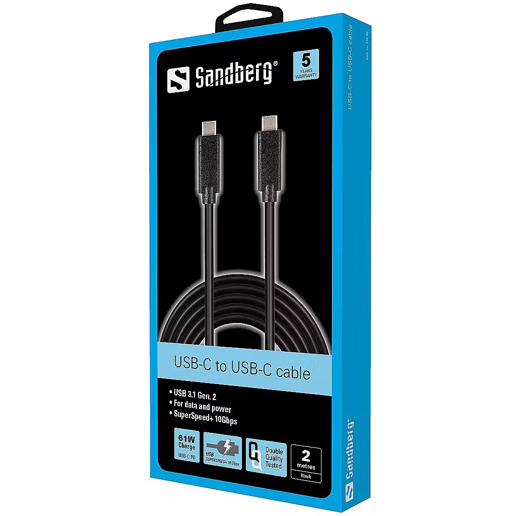 LongSummaryDescription - Sandberg USB-C > USB-C 2M USB 3.1 Gen.2. Cable length: 2 m. Connector 1: USB C, Connector 2: USB C, USB version: USB 3.2 Gen 2 (3.1 Gen 2), Connector gender: Male/Male, Product colour: Black