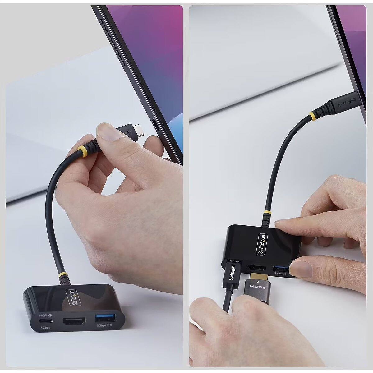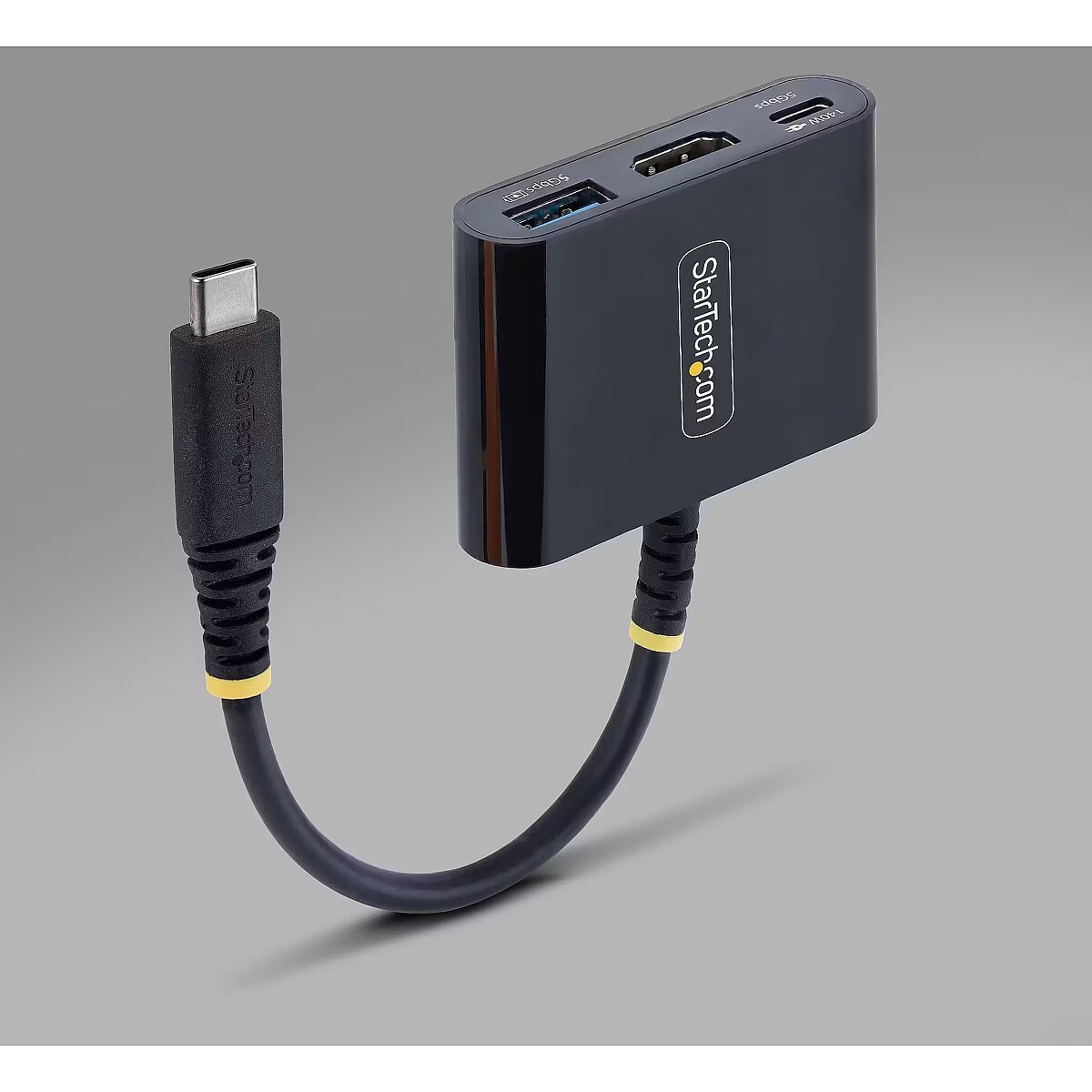 LongDesc - Create a mobile workstation wherever you work with an HDMI display, USB-A 5Gbps, and 140W PD pass-through with USB-C 5GbpsTurn a single USB-C port on a laptop, iPad, or tablet into display, power, and data connectivity with a compact adapter built for standardized IT deployments.Standardize Mobile Connectivity with One AdapterTurn one USB-C port into HDMI, USB-C, and USB-A, expanding connectivity without sacrificing ports. This adapter is ideal for mobile teams, travel kits, and field deployments, helping IT standardize accessories across mixed environments while keeping packs light.140W Power and Data Without Losing a PortUse the USB-C port for up to 140W Power Delivery 3.2 pass-through charging or 5Gbps data to support modern power requirements or high-speed peripherals. Keep systems charged or connected to storage without sacrificing limited USB-C ports, making this adapter ideal for hot-desk offices and conference rooms.Support Displays and Legacy PeripheralsDrive a native 4K 60Hz HDMI display directly from the system GPU with no drivers, preserving CPU resources for demanding workloads like visualization and data analysis. A USB-A 5Gbps port ensures continued support for keyboards, mice, flash drives, and dongles, easing the transition to USB-C laptops without the need to upgrade peripherals.Sustainable DesignThe adapter features a 75% post‑consumer recycled (PCR) plastic enclosure and a 35% PCR TPE jacket, helping reduce environmental impact and support ESG requirements.