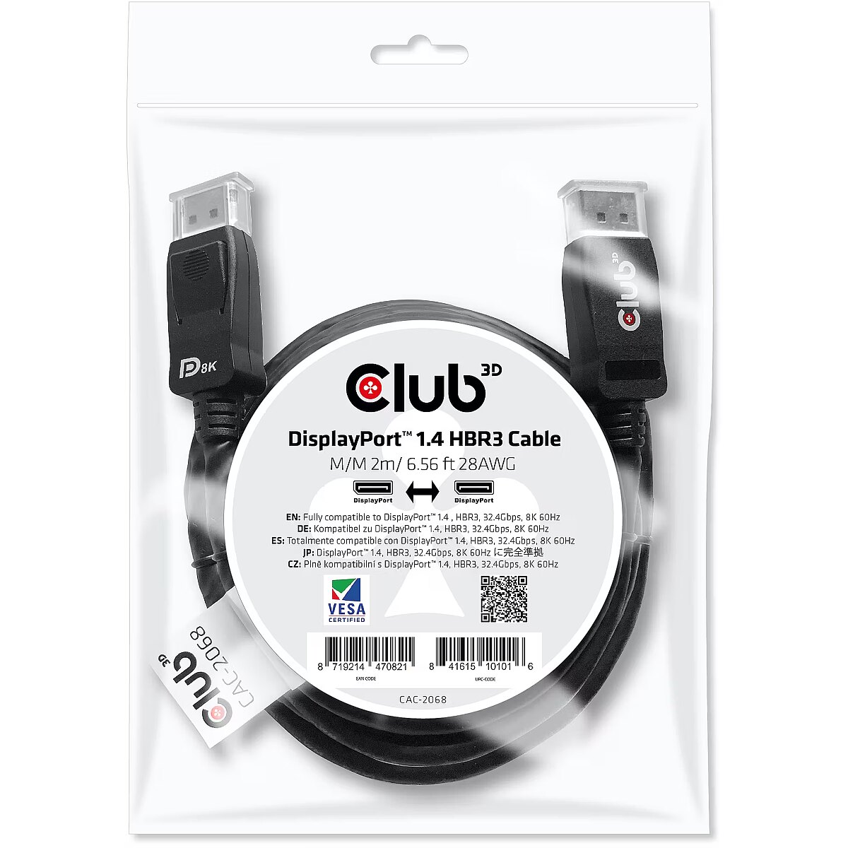 LongSummaryDescription - CLUB3D DisplayPort 1.4 HBR3 Cable 2m/6.56ft M/M 8K60Hz. Cable length: 2 m, Connector 1: DisplayPort, Connector 2: DisplayPort. Compliance certificates: RoHS, Certification: RoHS, CE, WEEE, REACH, Vesa. Weight: 141 g. Package width: 150 mm, Package depth: 100 mm, Package height: 215 mm. Quantity per pack: 1 pc(s)
