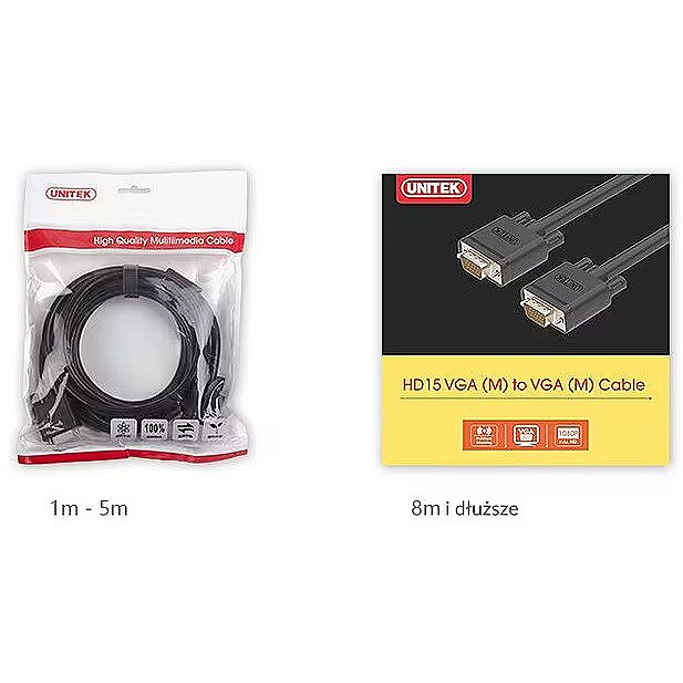 Vite Unitek cables are made of 100% copper, have gold-plated ends and are characterized by the highest parameters. Built-in ferrite fuses protect against EMI, RFI and other interference and stabilize the signal. The individual beams are repeatedly shielded with metal and aluminum foil, all so that the picture is clean, clear and without any distortions. Unitek VGA cables can cleanly transfer a Full HD image with a max. 1920x1080P resolution.