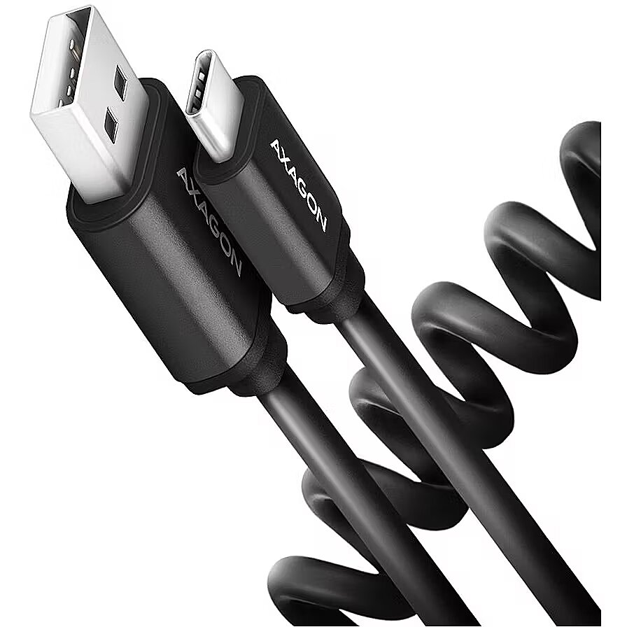 LongDesc - Twisted connection USB-C USB-A Data and Charging AXAGON BUCM-AM10TB TWISTER USB 2.0 cable with USB-C male and USB-A male connectors. The cable is designed for fast data transfers and notebook, phone, tablet and other mobile device charging. The cable supports data transfer at speeds up to 480 Mb/s, is compatible with Quick Charge, Samsung AFC, Huawei FCP, SMART and other charging technologies. The connected device can be charged with a current of up to 3A.Durable data and power cable with extended service life is equipped with metal terminals, connectors with a nickel-plated surface and gold-plated contacts. Cable conductors are made of Tin-plated oxygen free copper. High-quality cable insulation, made of flexible TPE, guarantees maximum durability and also maintains sufficient flexibility. Thanks to the twisted and winding design, the cable takes up a minimum of space and is an ideal accessory for the car. In the shortened state, the cable is only 35 cm long and does not obstruct anywhere. When stretched, it comfortably reaches 60 cm away from the socket.Power cables 22AWG (lower number = larger cross-section and lower wire resistance) guarantee fast charging of phones and other mobile devices. Data wires 30AWG together with high-quality shielding, ensure reliable data transmission. Double shielding protects transmitted signals from adverse interference.Durable cable gland reduces dangerous cable bending. The mechanical resistance of the cable is also increased by the aluminum terminal covers. Connectors:• USB-C (M) male • USB-A (M) male Other Features:• DATA SYNC & FAST CHARGING - simultaneous data transfer and mobile device battery charging.• USB 2.0, compatible with USB 1.1.• Supports 480 / 12 / 1.5 Mb/s (High / Full / Low speed) transmission rates. • Support for high-speed charging by current up to 3A.• Supported charging technologies: Qualcomm Quick Charge 2.0/3.0, Samsung Adaptive Fast Charging, Huawei Fast Charge Protocol, SMART Charging and others.• Cable includes power wires 22AWG, data wires 30AWG. • Tin-plated oxygen free copper conductors to reduce oxidation, increase conductivity, and clear signal without distortion.• Shielding via galvanized foil and oxygen free copper braiding minimizes interference and prevents signal loss.• Nickel-plated connectors and gold-plated contacts prevent oxidation and provide a reliable connection.• Suitable for mobile phones and smartphones, tablets, powerbanks, cameras and other mobile devices with USB-C connector.Other data: • Cable length 60 cm in stretched state, 35 cm in shortened state,• outer diameter of the cable 4.2 mm.Package contains:• USB-C M USB-A M twisted black cable, • packed in a printed and sealed foil package with hanging hole.