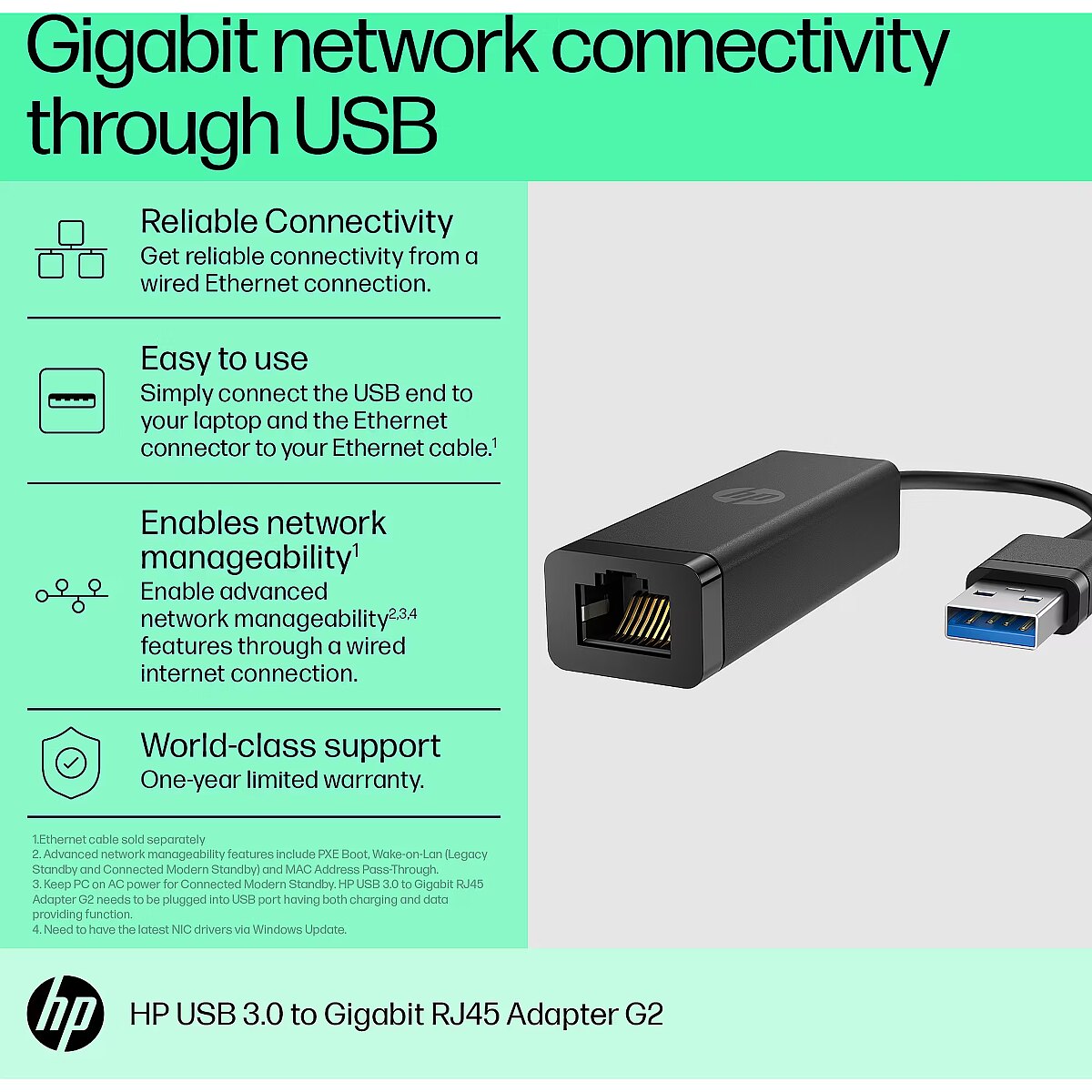 LongDesc - Gigabit network connectivity through USBConvert your laptop's high-speed USB 3.0 connection to a fast 10/100/1000 Ethernet connection with the HP USB 3.0 to Gigabit RJ45 Adapter G2.