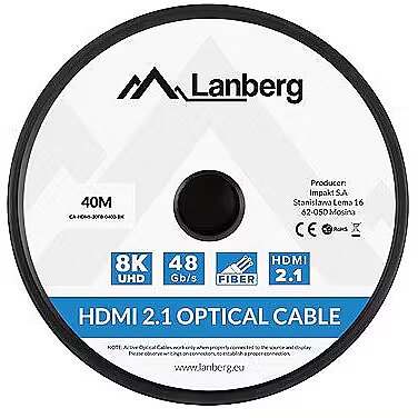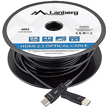 Description - CABLE HDMI M/M V2.1 40M 8K BLACK OPTICAL AOC LANBERG Optical HDMI cables allow for lossless transmission of audio and video signals over huge distances. Thanks to the use of optical fiber as a conductor, they are extremely thin, which facilitates cable routing, additionally ensuring resistance to electromagnetic interference. The latest HDMI 2.1 (Ultra High Speed) standard allows you to transmit images in 8K quality at a refresh rate of 30 Hz. Using DSC (Display Stream Compression) technology, you can increase the resolution up to a maximum of 10K! ATTENTION Due to its construction, an optical HDMI cable only transmits the image in one direction. Pay attention to the markings on the plugs in order to connect the product correctly.