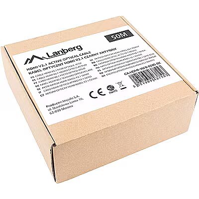 Description - CABLE HDMI M/M V2.1 50M 8K BLACK OPTICAL AOC LANBERG Optical HDMI cables allow for lossless transmission of audio and video signals over huge distances. Thanks to the use of optical fiber as a conductor, they are extremely thin, which facilitates cable routing, additionally ensuring resistance to electromagnetic interference. The latest HDMI 2.1 (Ultra High Speed) standard allows you to transmit images in 8K quality at a refresh rate of 30 Hz. Using DSC (Display Stream Compression) technology, you can increase the resolution up to a maximum of 10K! ATTENTION Due to its construction, an optical HDMI cable only transmits the image in one direction. Pay attention to the markings on the plugs in order to connect the product correctly.
