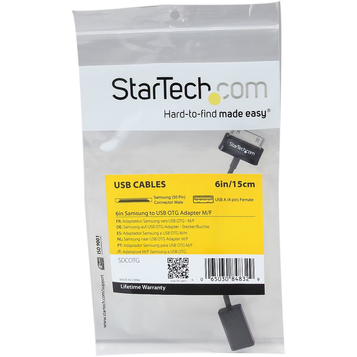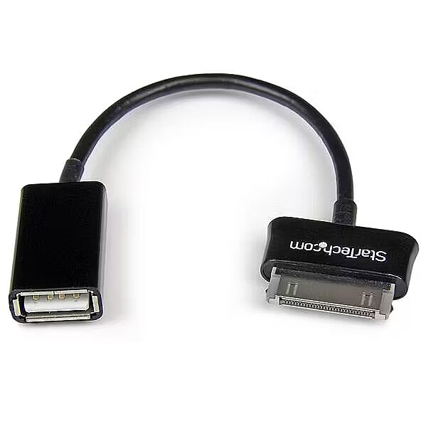 LongDesc - Turn your Samsung Galaxy Tab into a USB host and connect USB devices (thumb drives, mice, keyboards…etc.)The SDCOTG USB On-The-Go (OTG) Adapter Cable for the Samsung Galaxy Tab features one (30-pin) Samsung male connector and one (4-pin) USB Type ‘A’ female connector, delivering a simple way to add a USB port to your Galaxy Tab and enable you to connect USB accessory devices (e.g thumb drives, mice, keyboards). The Samsung Tab OTG adapter cable is designed and constructed for maximum durability, to ensure dependable, long-lasting connections, and is backed by StarTech.com’s lifetime warranty.The StarTech.com Advantage- Converts your Samsung Galaxy Tab into a USB host, for connecting USB accessories and enabling you to download pictures, transfer data and work more efficiently- The USB port added by the adapter is situated approximately 6 inches away from the Samsung Galaxy Tab, offering more flexibility for connecting USB devices- Backed by StarTech.com lifetime warranty