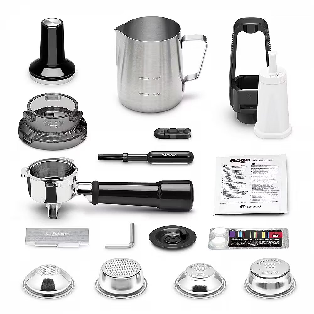 Accessories included - Dosing funnel 54mm diameter portafilter Single and double bottom filter screens Razor precision coffee leveler Built-in tamper 480ml stainless steel milk jug Cleaning kit Water filter