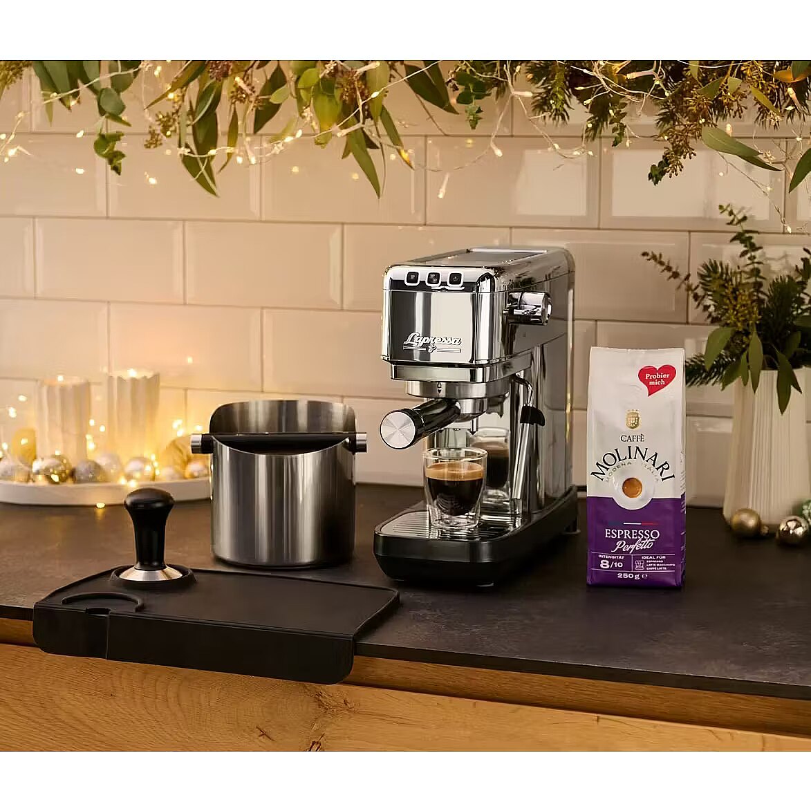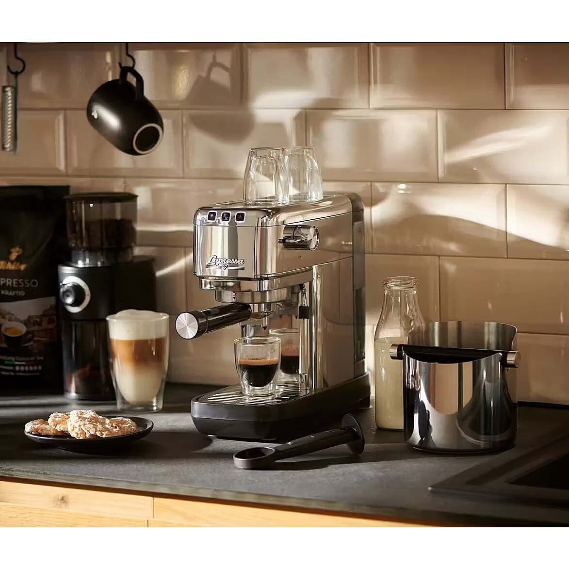A portafilter espresso machine ensures the ultimate espresso enjoyment, just like in sunny Italy: the Tchibo Lapressa. With a pump pressure of up to 15 bars, it can be used to prepare perfect Italian espresso and espresso-based milk drinks such as cappuccino, espresso macchiato, and more. The machine comes with two double-walled filter inserts for preparing a single or double espresso (doppio). The dual spout allows you to brew two espressos at the same time. Using the swivel milk frothing nozzle, you can prepare milk-based beverages such as cappuccino, and the machine allows you to control the temperature and texture of the milk foam.