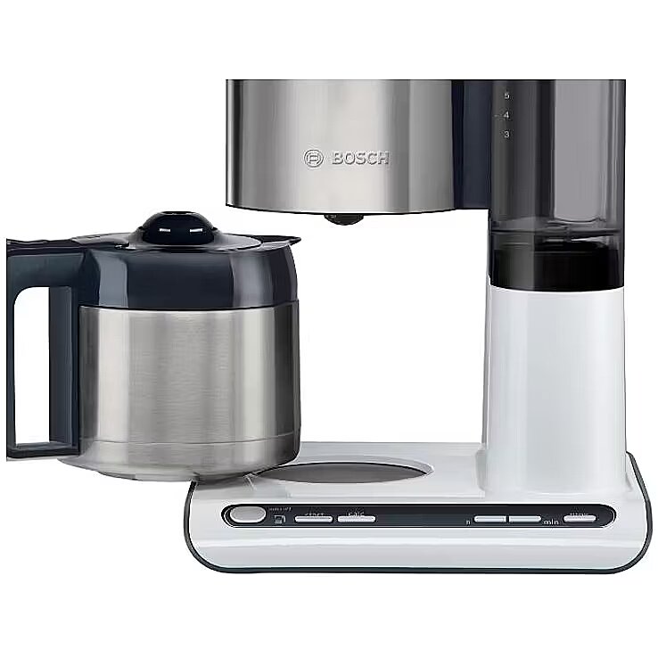 LongSummaryDescription - Bosch TKA8A681. Product type: Drip coffee maker, Coffee maker type: Semi-auto, Water tank capacity: 1.1 L, Coffee input type: Ground coffee, Reservoir for brewed coffee: Jug, Capacity in cups: 8 cups. Power: 1100 W. Product colour: Black, Stainless steel, White