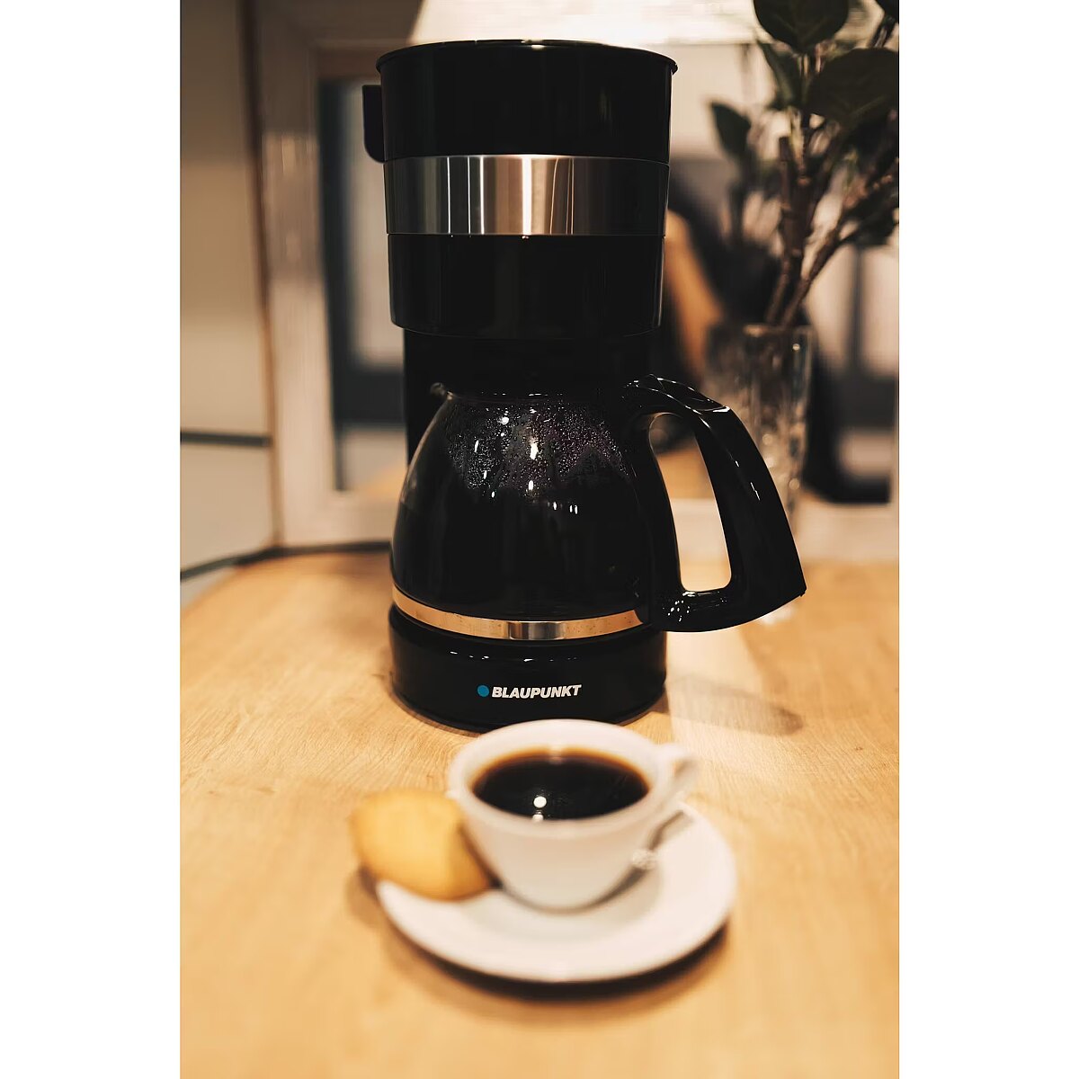 Description - Drip Coffee Makers CMD401 Prepare coffee easily! Drip coffee makers conquered peoples hearts many years ago. Everybody wanted that kind of equipment in their kitchen. The wonderful aroma of freshly brewed coffee spread all over the apartment or office, putting everyone in a positive mood. But as time went by, these coffee makers slightly lost their popularity in favour of espresso makers. Today, drip coffee makers are back in the game because theres nothing like a small cup of black coffee in the morning. They owe their popularity to the extremely simple operation, the possibility of preparing more grounds-free coffee at once and maintaining the temperature of the beverage for a longer time. They are perfect not only for homes, but also for offices. The Blaupunkt CMD401 drip coffee maker is the perfect choice for all those who drink relatively large amounts of black and classic coffee, and for those who also value the ease with which it can be prepared. Coffee made in a drip coffee maker is also a great alternative to coffee brewed in a cup, as it is free of grounds, and after brewing it has an equally intense flavour. The CMD401s principle of operation is extremely simple. Place a reusable nylon filter (included) or a replaceable paper filter (1×4) in the basket above the jug, then put in the ground coffee. Then pour the water into the dedicated tank with a maximum capacity of 1.25 L and turn on the coffee maker. The heated water seeps through the coffee, and the finished brew goes into the jug. This way you can prepare 10-12 coffee cups at once. Once the brewing process has ended, empty and wash the nylon filter so that it can be reused, or dispose the paper filter. This appliance is also perfect for brewing leaf tea. The procedure is the same as for coffee brewing, except that you need to put tea leaves in the filter. The CMD401 drip coffee maker is equipped with a function for maintaining temperature, so if you should reach for coffee even after some time, you can be sure that it will still be warm. At some point, anyone can forget to turn off the coffee maker. The manufacturer made sure that the CMD401 will automatically switch off after being inactive for 40 minutes.