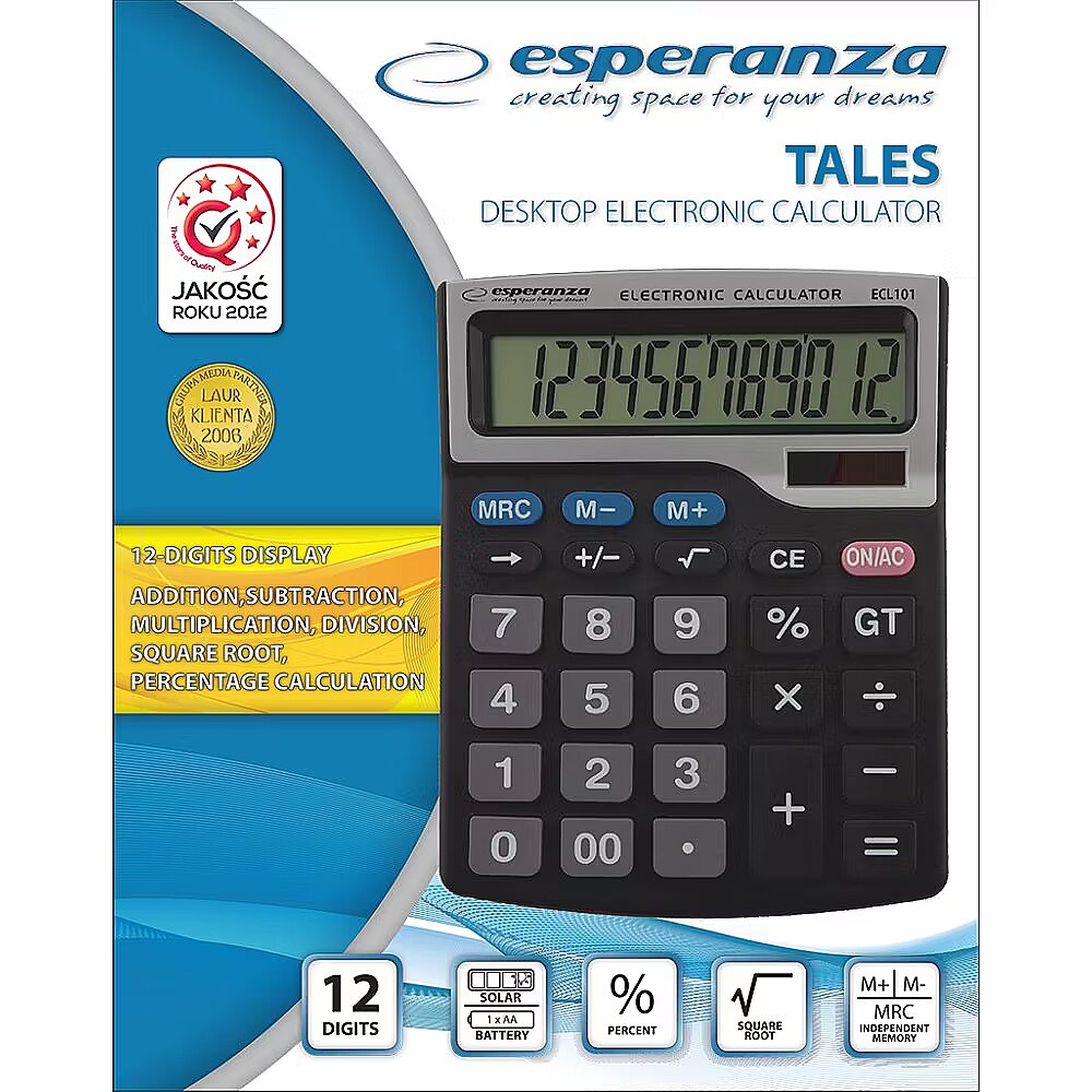 Description - Electronic desktop calculator with large, 12-digit display. It has all the basic math functions (addition, subtraction, multiplication, division, square root, calculating percentages), the function of reversing typed numbers and the possibility of storing the results. Leaning display, large display digits and large keys make it easy to work with the calculator. Ideal for everyday use in shops and offices.
