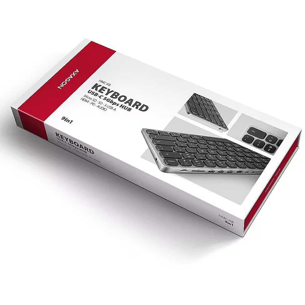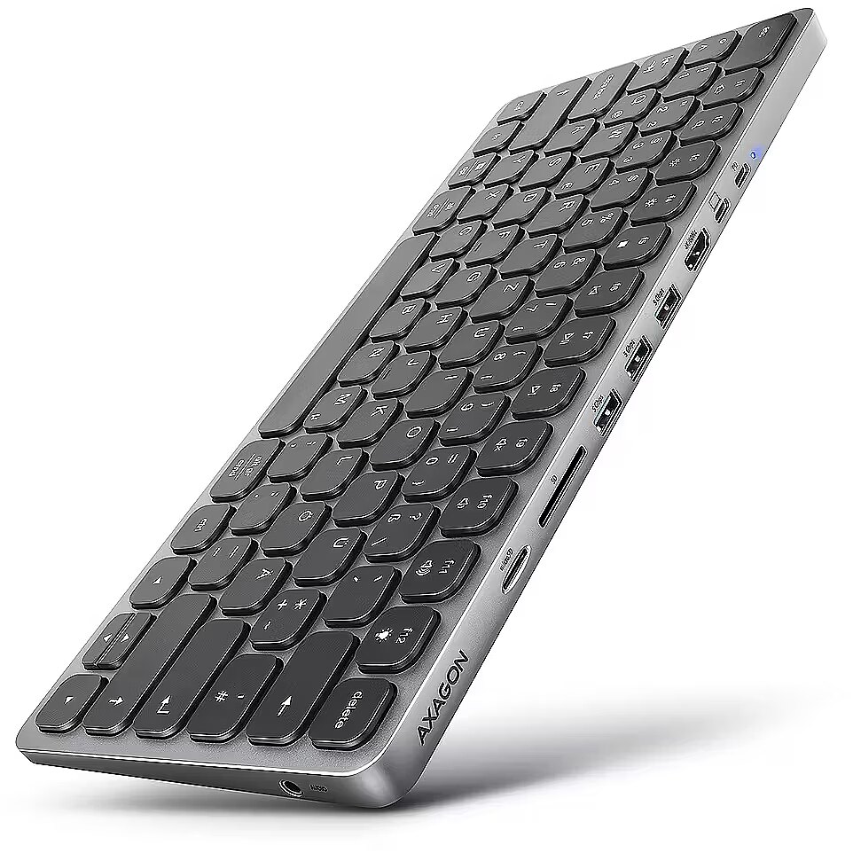 LongDesc - AXAGON HMC-KB-GE KEYBOARD hub turns your phone, tablet or mini-laptop into a full-fledged computer workplace. You connect your mobile device to the 9in1 docking station via the supplied 60 cm long cable. In no time, you have an integrated keyboard, SD and microSD card reader, and connectors for connecting an external monitor, three USB devices, headphones or headset, and Power Delivery power. However, it is necessary that the USB-C port of your mobile device supports video output (DisplayPort Alternate Mode) and Power Delivery.The keyboard, built into an elegant aluminum hub body, is equipped with chiclet keys with a scissor mechanism and 2 mm stroke for precise and quiet typing. The keyboard offers adjustable backlighting in 5 levels, 12 multimedia keys and the possibility of increasing the inclination for comfortable and ergonomic use. Of course, the keys are printed with English localization.The HDMI output enables the connection of an external monitor, TV or projector with a resolution of up to 4K/60Hz Ultra HD, 2K/120Hz Quad HD or 1080p/200Hz Full HD and the transmission of multi-channel audio. Thanks to HDR support, you can enjoy a significantly expanded range of colours and contrasts without limitations.Three USB-A 5Gbps outputs allow connection of external drives (up to 2 at the same time), flash drive, mouse, printer and other USB accessories. The USB ports also charge mobile phones and tablets with a power of up to 7.5W. The memory card reader supports reading and writing of all versions of SD and microSD cards with a capacity of up to 2TB. The card reader enables simultaneous handling of cards in both slots and direct copying between them. The 3.5 mm audio output offers the possibility of connecting stereo headphones, a headset or active speakers.The PD USB-C input is designed for a suitable Power Delivery charger. This allows both your mobile device and the hub to be powered directly from the PD charger using Power Delivery 3.0 technology with up to 100W of power.The Multiport Hub with Keyboard is especially ideal for users of phones and tablets Samsung's DeX-enabled Z-series Fold (from Fold3), Galaxy S (from S9), Note (from Note8) and Galaxy Tab S (from S4 except Lite and FE versions). The Dock also enables desktop mode for the Apple iPad Pro and iPad Air (from 2022) tablets. In addition, it ensures compatibility with iPad mini (from 2021) and with iPhone 15 Pro / Pro Max phones, while the image is transferred via mirroring. Input (connection to mobile device / computer):• USB 5Gbps (USB 3.2 Gen 1 / USB 3.0), USB-C female connector.• Compatible with USB 3.2 Gen 2, USB4 and Thunderbolt 3/4.Input (power supply):• USB Power Delivery 3.0 100W port (only for charging), USB-C female connector.• Powering the mobile device from the mains adapter via the USB-C hub.• PD power must be supported by both the mobile device and the mains charger.USB outputs:• 3x USB 5Gbps port, USB-A female connector.• USB-C hub handle the connection of two external drives simultaneously.• Charging of mobile devices (including iPad) with a current of up to 1.5A from the hub's USB-A ports.Video output:• 1x HDMI A port, HDMI A female connector.• 4K / UHD resolution 4096 x 2160 at up to 60Hz. • 2K / QHD / WQHD resolution 2560 x 1440 at up to 120Hz. • 1080p / FHD resolution 1920 x 1080 at up to 200Hz.• Support for the above max. supported resolutions and frequencies requires connection to a computer with DisplayPort version 1.4. • For the video output function, the hub must be connected to a USB-C port supporting DisplayPort Alternate Mode (DP Alt Mode) or to a USB-C port supporting Thunderbolt 3/4. A suitable OS is also required. The video output function will not be available without these requirements.• HDR support (High dynamic range, 10bit/RGB support) - realistic reproduction of light and dark details.• HPD (Hot-Plug-Detect) support.• TMDS (Transition Minimized Differential Signalling) support.• HDCP 1.4 and 2.3 (High-bandwidth Digital Content Protection) full support.• Support for 2-channel audio sampling rate up to 192 kHz and up to 24-bit audio - depends on source and end device, i.e. mobile device/computer and TV/monitor/AV receiver.The card reader - two slots: • Slot Micro SD: microSD / microSDHC / microSDXC / TransFlash.• Slot SD: SecureDigital / SDHC / SDXC, MultiMedia Card, MMC, MMC Dual Voltage, MMC mobile, RS-MMC, with adapter - miniSD, microSD / microSDHC / microSDXC, MMC Micro.• UHS-I support. Speed up to 104 MB/s. Support hardware ECC function and CRC function.• 2 LUN - the reader is indicated as two disk drives. The possibility of copying from card to card.Audio output / input:• 1x 3.5 mm 4pin jack for headset, headphones or active speakers,• 2-channel analog stereo output 48 kHz @ 16 bit for playback, • 1-channel analog mono microphone input 48 kHz @ 16 bit for recording.Keyboard:• Keys with scissor mechanism and 2 mm stroke for precise and silent typing. • 12 multimedia keys: home, search, brightness, stop / start play / pause, previous / next track, mute, volume, backlight. • White key backlight with four intensity settings and backlight off (f12). • Switch between OS: fn+S for Windows / Android, fn+A for macOS / iPadOS / iOS.Other features: • Possibility to connect your device while running thanks to the Hot Plug support.• Full Plug and Play support.• Standby mode support.• Power via USB bus - USB bus power or from PD wall charger.• Heavy-duty aluminium body for better hub cooling. • The LED indicates with constant light the hub connection to the computer.• High quality shielded cable ensures fast communication speed and minimal unwanted interference.• Dimensions 296 x 128 x 11 / 6 mm.• Weight 353 g (without cable).• USB-C cable 60 cm long with connectors C-M straight / C-M bent 90°.Supported operating systems: • Microsoft Windows 10 / 11 and later, macOS, iPadOS, iOS, Linux, Chrome OS and Andr