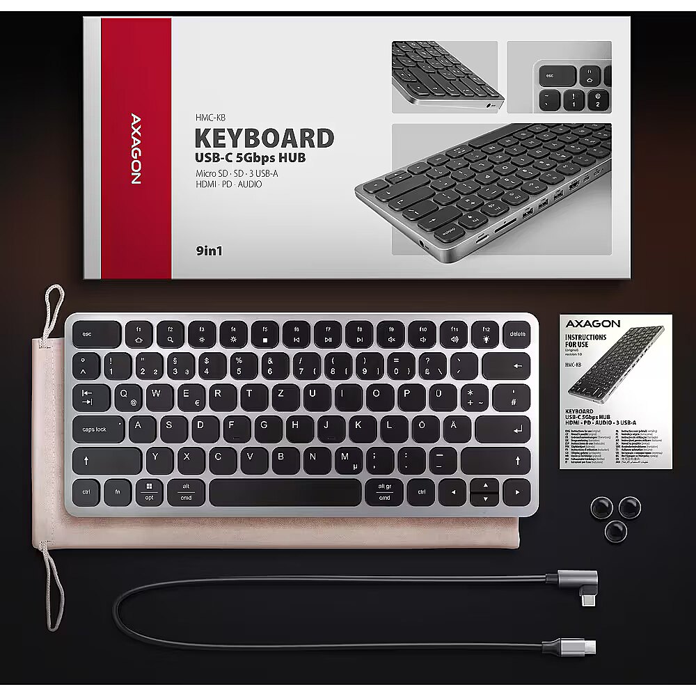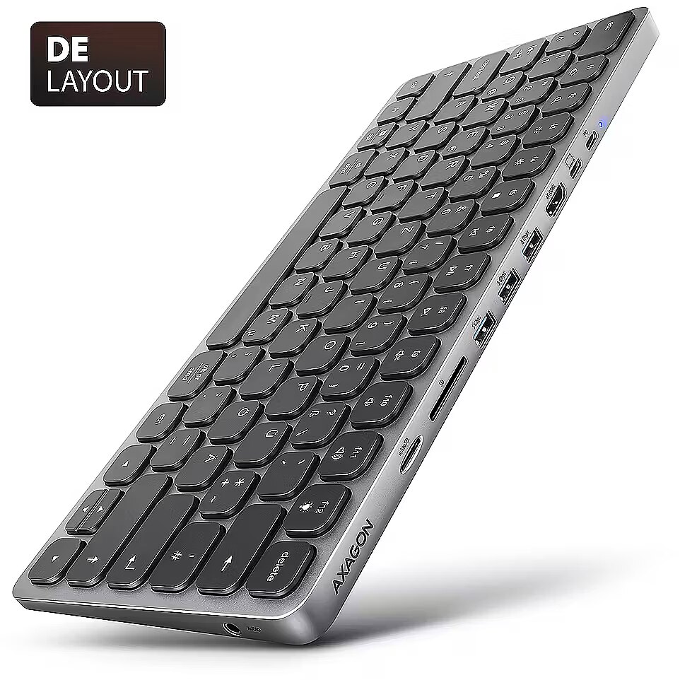 name - AXAGON HMC-KB USB-C Tastatur, microSD/SD, 3x USB-A 3.0, HDMI 4K/60Hz, PD 100W, Audio - DE Layout