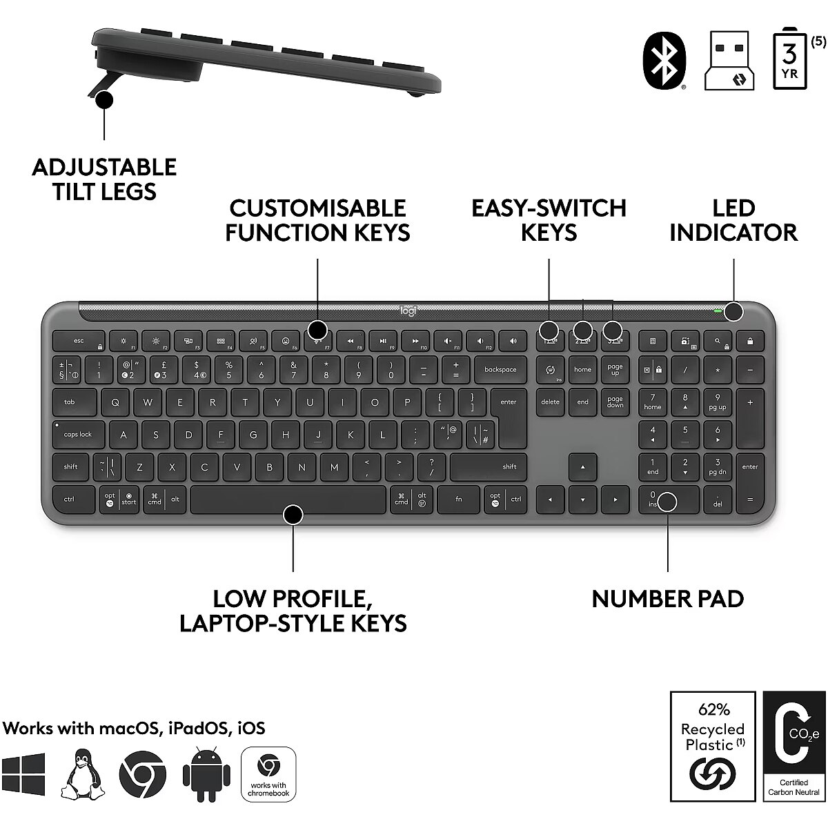 Keyboard Features - Num Keypad Aluminium plate Adjustable Tilt Legs Connect up to 3 Devices