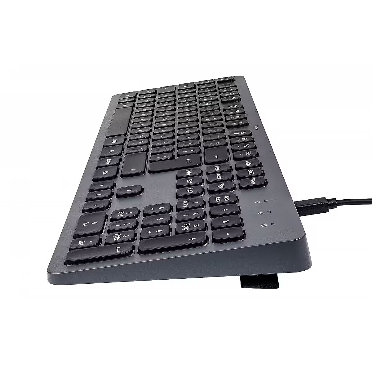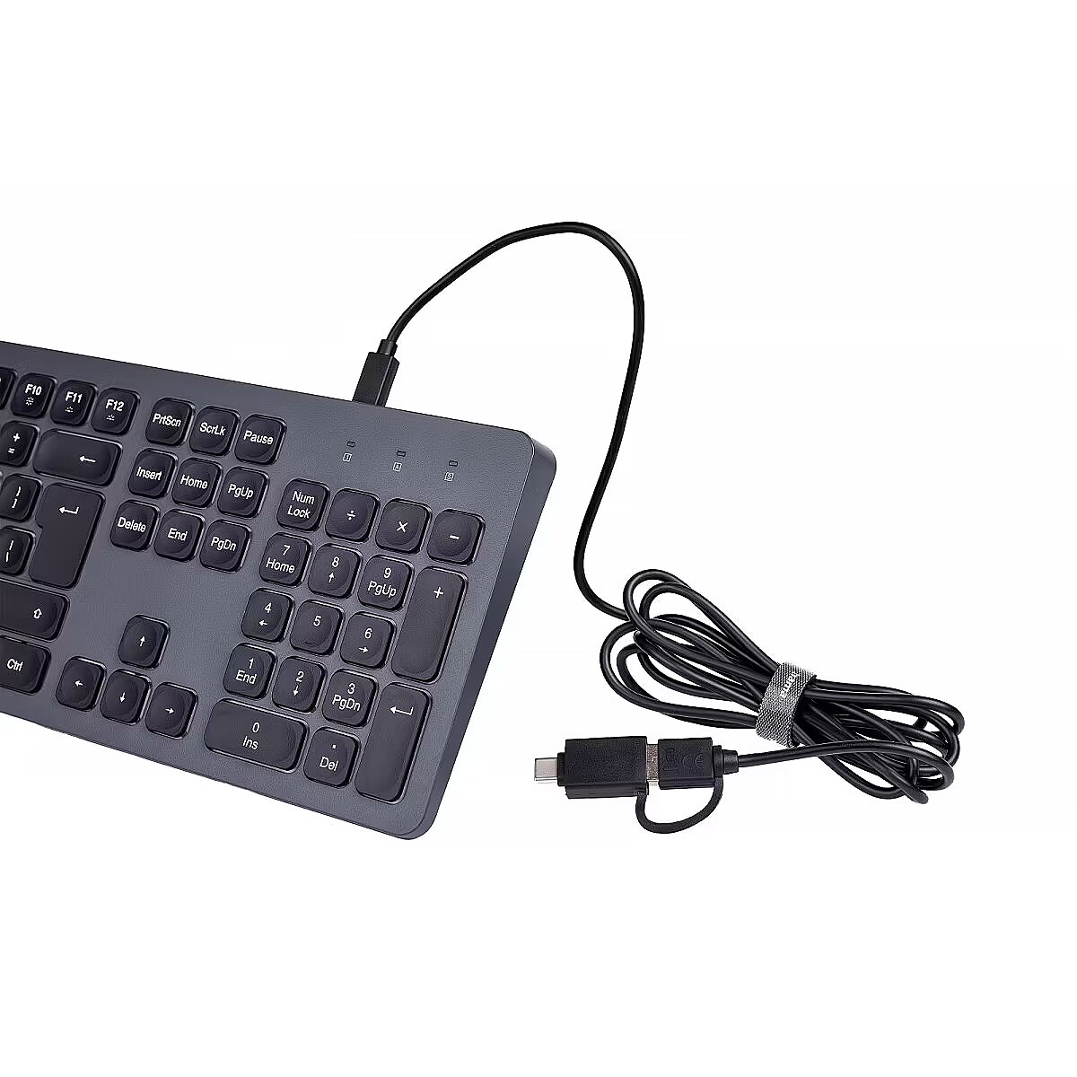 Klawiatura przewodowa z odczepianym kablem USB zapewnia szybkie połączenie z urządzeniem za pomocą złącza USB-A lub USB-C. W przypadku uszkodzenia kabla, można go łatwo wymienić bez konieczności wymiany całej klawiatury, co znacząco zwiększa trwałość urządzenia i obniża koszty eksploatacji. Zintegrowany adapter USB-C do USB-A zapewnia kompatybilność z urządzeniami wyposażonymi w różne typy gniazda USB.