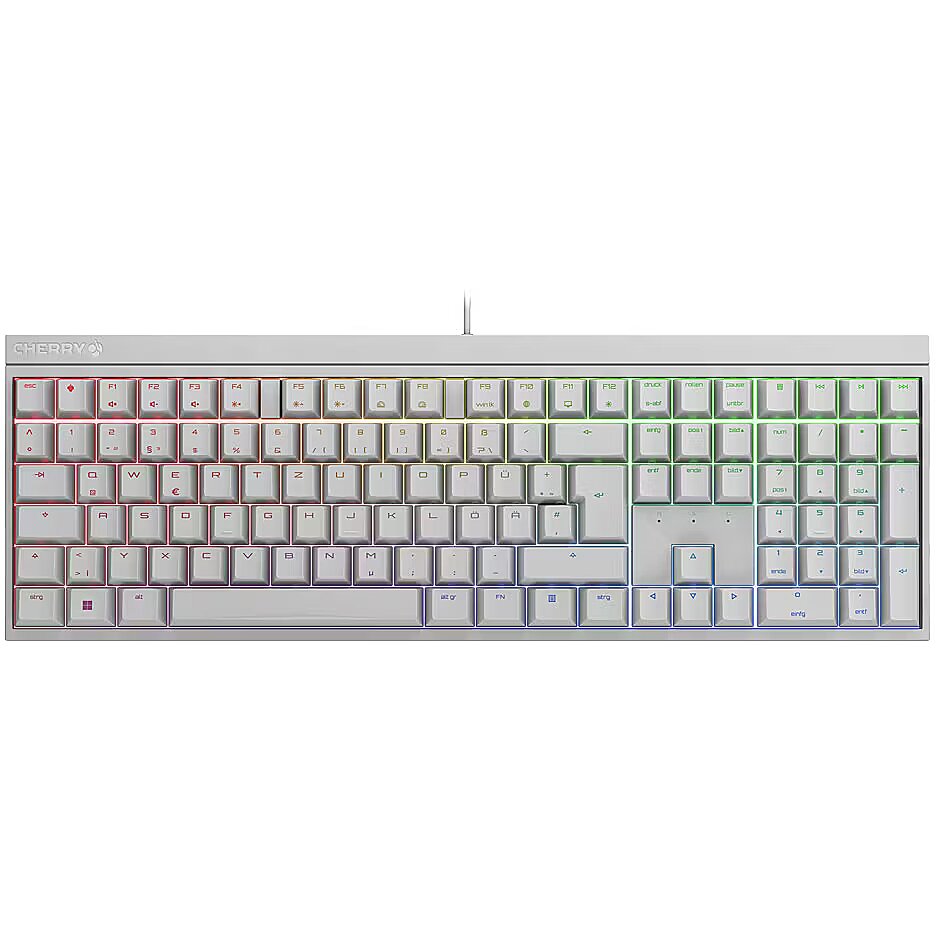 LongSummaryDescription - CHERRY MX 2.0S RGB. Keyboard form factor: Full-size (100%). Keyboard style: Straight. Connectivity technology: Wired, Device interface: USB, Keyboard key switch: Mechanical, Keyboard layout: QWERTZ, Keyboard number of keys: 110. Backlight type: RGB LED. Cable length: 1.8 m. Recommended usage: Gaming. Product colour: White