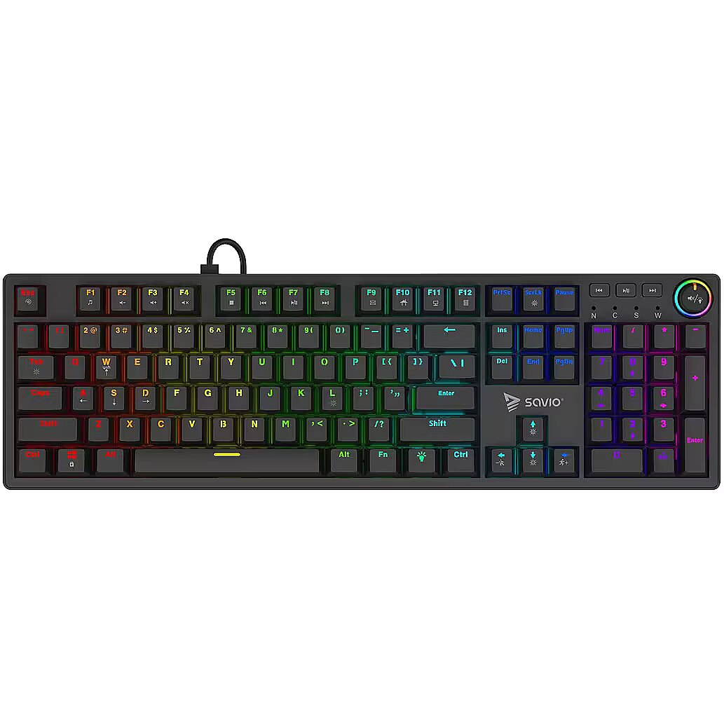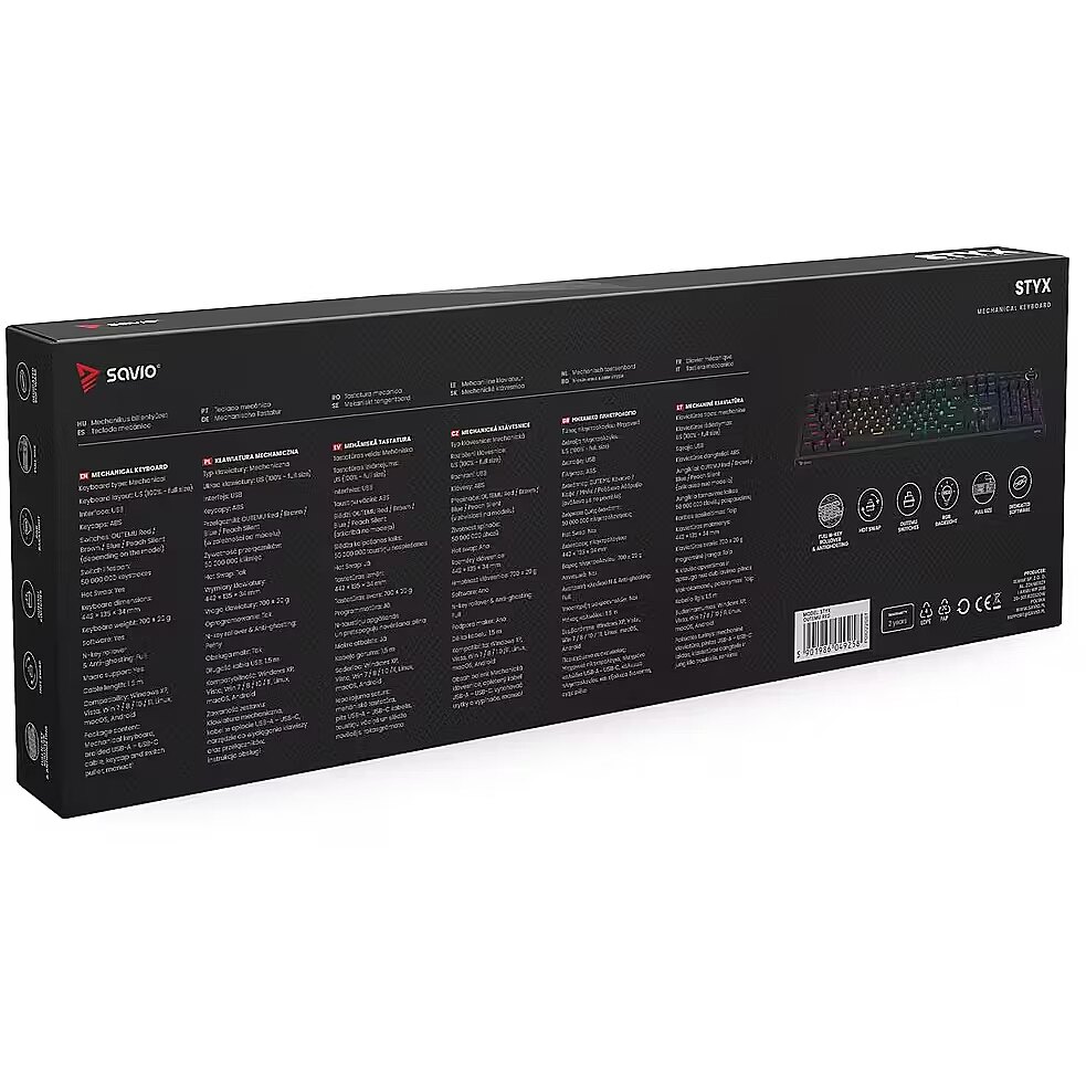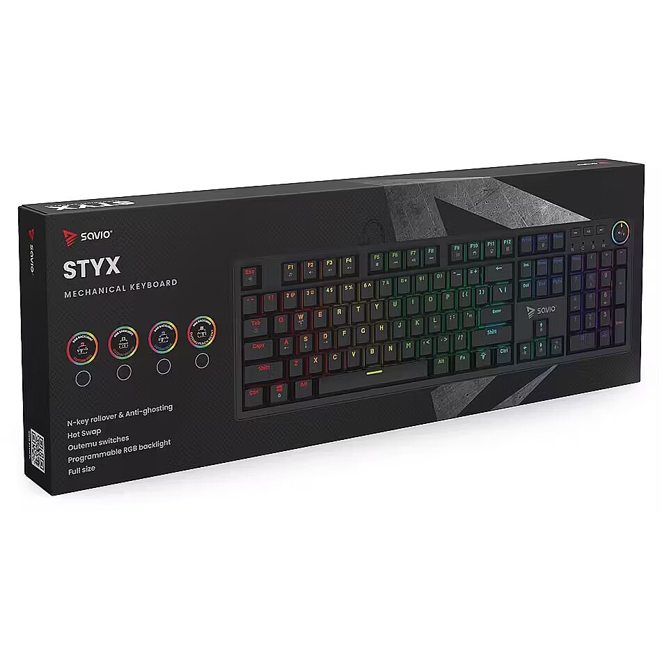 Description - Mechanical keyboard STYX OUTEMU Savio STYX is a full-size mechanical keyboard created for gamers and professionals who dont accept compromises. It combines everyday comfort with gaming-grade performance and striking design. With rich personalization, high durability, and modern features, STYX excels both in gameplay and at work. Full N-Key Rollover & Anti-ghosting The Savio STYX features N-key rollover the ability to register many key presses simultaneously. In addition, Anti-ghosting (eliminating false signals from keys that werent actually pressed) ensures maximum precision. Even the most dynamic key combinations in games or office work are captured flawlessly. Hot-swap Function STYX offers Hot-swap (the ability to replace switches yourself without soldering). In just moments you can swap to different switches to tailor the keyboards feel to your needs no specialized tools required. Its a perfect solution for anyone who wants to experiment with various switch types or easily replace worn parts. OUTEMU BROWN Switches tactile precision and comfort In the version with OUTEMU BROWN switches (i.e., tactile mechanical switches with a noticeable actuation bump, moderate operating force, and quiet operation), STYX offers an excellent balance between control and speedideal for both gaming and long typing sessions. The gentle tactile bump helps you feel the exact actuation point, which translates into fewer errors and greater comfort. The switches are rated for up to 50 million keystrokes. 21 RGB Lighting Modes The keyboard offers full RGB (Red, Green, Blue) backlighting with 21 modes to choose from. From static effects to dynamic animations you can easily match the lighting style to your mood, game, or desk aesthetic. Full-size Layout STYX is a full-size keyboard with a complete key layout, including a numeric keypad and dedicated multimedia keys. This gives you maximum functionality whether youre gaming, working, or editing media. An additional advantage is the multifunctional knob, which lets you adjust volume and lighting without using key shortcuts. Specification Keyboard type: Mechanical Keyboard layout: US (100% - full size) Interface: USB Keycaps: ABS Switches: OUTEMU Red / Brown / Blue / Peach Silent (depending on the model) Switch lifespan: 50 000 000 keystrokes Hot Swap: Yes Keyboard dimensions: 442 x 135 x 34 mm Keyboard weight: 766g Software: Yes Length: 1.5 m Compatibility: Windows XP, Vista, Win 7 / 8 / 10 / 11, Linux, macOS, Android Package content: Mechanical keyboard, braided USB-A USB-C cable, keycap and switch puller, manual