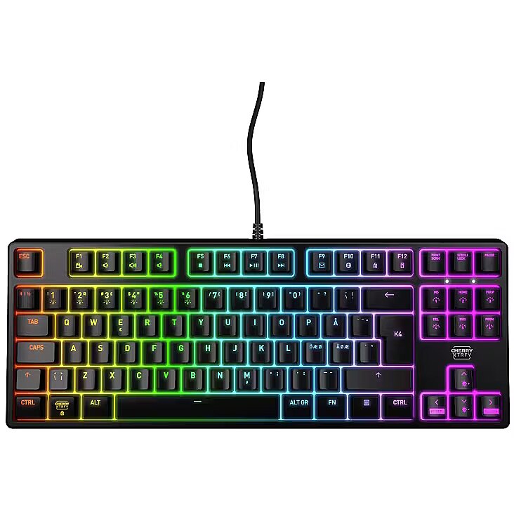 LongSummaryDescription - CHERRY XTRFY K4V2 RGB TKL. Keyboard form factor: Tenkeyless (80 - 87%). Keyboard style: Straight. Connectivity technology: Wired, Device interface: USB, Keyboard key switch: Mechanical, Keyboard layout: QWERTY. Backlight type: RGB LED. Cable length: 2 m. Recommended usage: Gaming. Product colour: Black