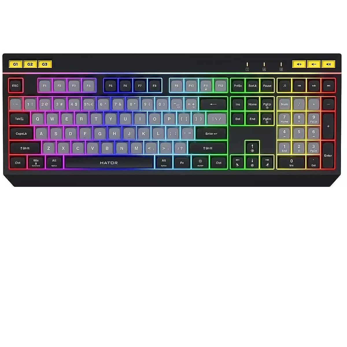 LongDesc - HATOR Icefall full-size membrane keyboard is an ideal choice for those who appreciate convenience and high performance. With quiet operation, a wide range of functions, a thoughtful design and rich RGB lighting, this keyboard is suitable for a variety of usage scenarios.The membrane ensures silent operation of the buttons, which is important in many situations. The softness and quiet pressure of the keys create a comfortable environment for busy work and games.Keycaps with a UV coating and laser engraving will provide greater resistance to erasing symbols and better protection against wear and tear due to frequent use.The keyboard is equipped with keys for controlling multimedia. This allows you to quickly and conveniently control music playback and other functions without distracting from thу work or game.Icefall has separate buttons for quickly switching between memory profiles. Save your settings and macros and activate them in one click, depending on the current tasks. And also use these profiles on any computer without the need to reconfigure them.HATOR Icefall has bright RGB lighting with the ability to adjust for 8 separate zones. Eight preset lighting effects and a custom mode are available for individual customization. This allows you to create a unique atmosphere and emphasize individual style.The keyboard has two height levels, which allows you to choose the optimal position for comfortable work and games. This feature reduces stress on your wrists and ensures long-term use without fatigue.The software allows you to create and save macros, making it easier to create complex commands. This is especially useful for gamers and professionals who require high speed and accuracy.