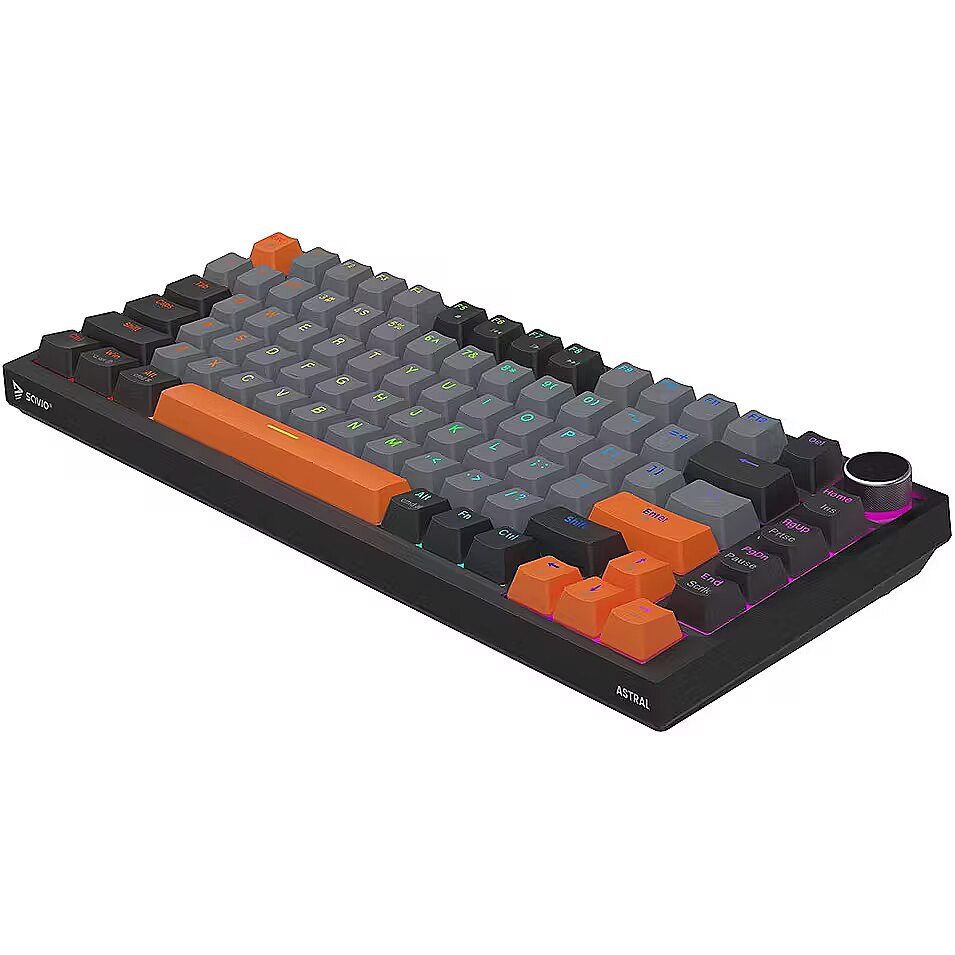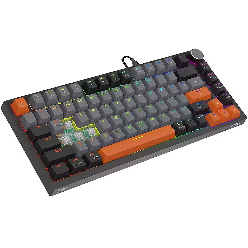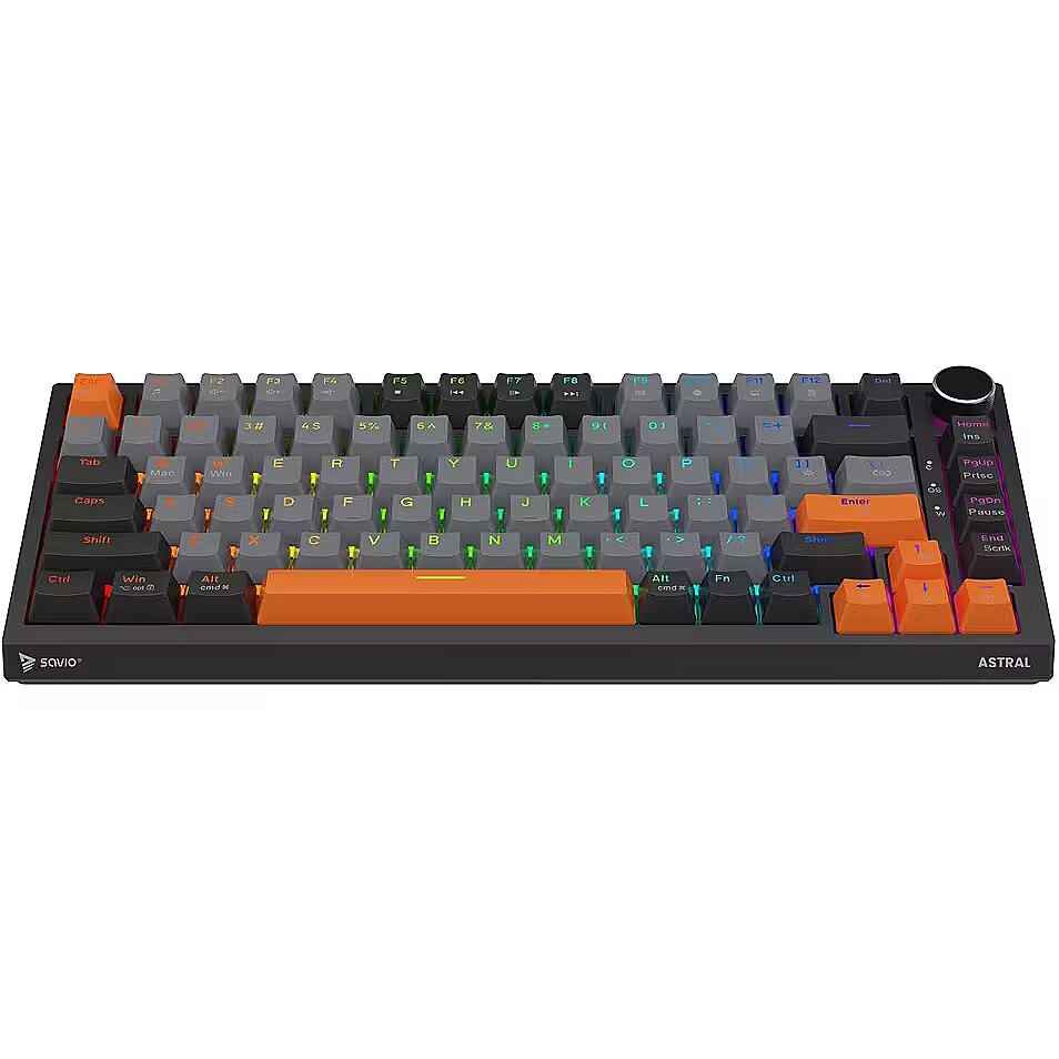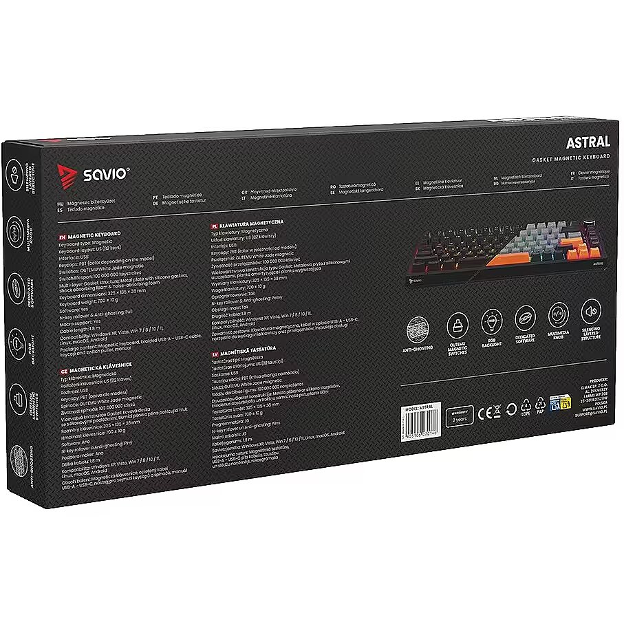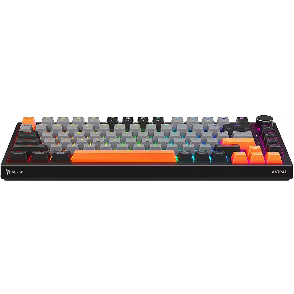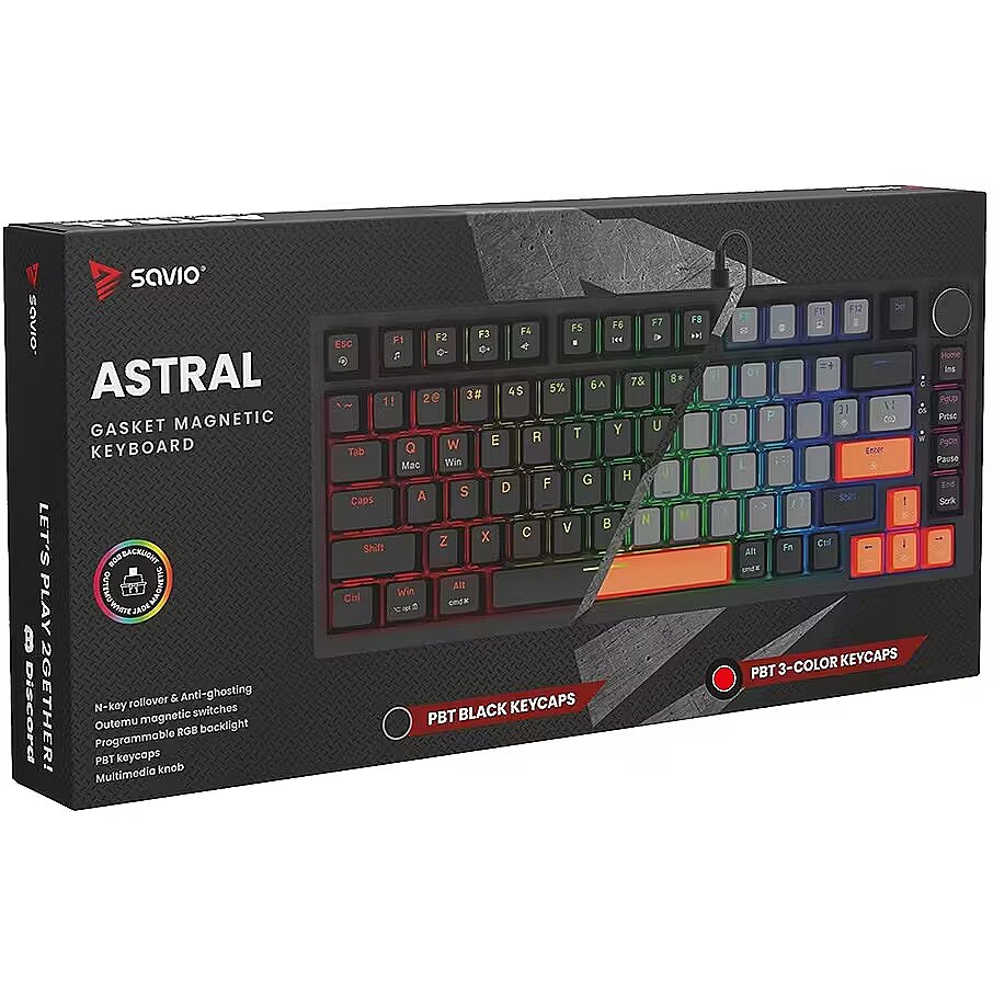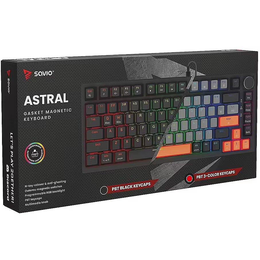Description - Gasket magnetic keyboard ASTRAL, OUTEMU White Jade, 3-color keycaps Meet ASTRAL the keyboard that changes the rules of the game. This isnt just another classic mechanical keyboard. Its an advanced weapon in your arsenal, built on revolutionary magnetic technology. Encased in a compact 82-key layout, it saves valuable desk space for wider mouse movements without sacrificing functionality. Built with a Gasket Mount structure, the keyboard provides an incredible typing and gaming experience. Thanks to the metal plate with silicone gaskets and layers of damping and sound-absorbing foam, every keystroke feels soft while unwanted echoes and noise are completely eliminated. Full N-key Rollover and Anti-ghosting In the heat of battle, every millisecond and every command matters. ASTRAL comes equipped with full N-key rollover. What does that mean? You can press all keys at the same time, and the system will flawlessly register each one. This feature is complemented by Anti-ghosting technology. Forget about annoying ghosts those moments when the keyboard registers a key you didnt press or fails during complex combos. Here, you can be sure that your combo executes exactly as intended. Outemu White Jade Magnetic Switches At the heart of ASTRAL are the advanced Outemu White Jade magnetic switches, which use a Hall-effect sensor to detect the position of a magnet instead of a traditional physical contact. As a result, actuation is completely contactless, significantly increasing the keyboards durability and precision. What does this mean for you? Reduced mechanical resistance and faster response compared to traditional mechanical switches Exceptional smoothness: the movement is perfectly linear and fluid Legendary durability: lifespan rated at 100,000,000 clicks  a long-term investment for years of intensive gaming Programmable RGB Backlighting The keyboard features fully programmable RGB lighting, capable of displaying over 16 million colors. With dedicated software, you can create your own macros (command sequences) and customize lighting effects to match your mood or the game youre playing. PBT Keycaps Forget about slippery, shiny keycaps that collect fingerprints. ASTRAL is equipped with PBT keycaps (polybutylene terephthalate) a material much harder and more durable than standard ABS. PBT keycaps offer: A matte, slightly textured surface for a stable grip even during intense gameplay Exceptional wear resistance the legends remain crisp and readable for years Multimedia Control Knob Full control without leaving your game. The built-in, elegant multimedia knob lets you instantly adjust or mute the volume with a single motion. No more shortcuts or minimizing your game just to hear your opponents footsteps or lower the music. Its convenience youll appreciate every day.