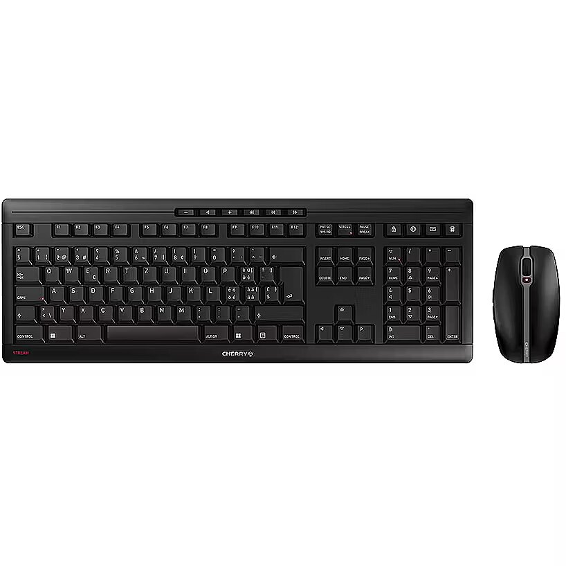 LongSummaryDescription - CHERRY Stream Desktop Recharge. Keyboard form factor: Full-size (100%), Connectivity technology: Wireless, Device interface: RF Wireless, Keyboard layout: QWERTZ, Keyboard number of keys: 115, Recommended usage: Universal. Product colour: Black. Mouse included