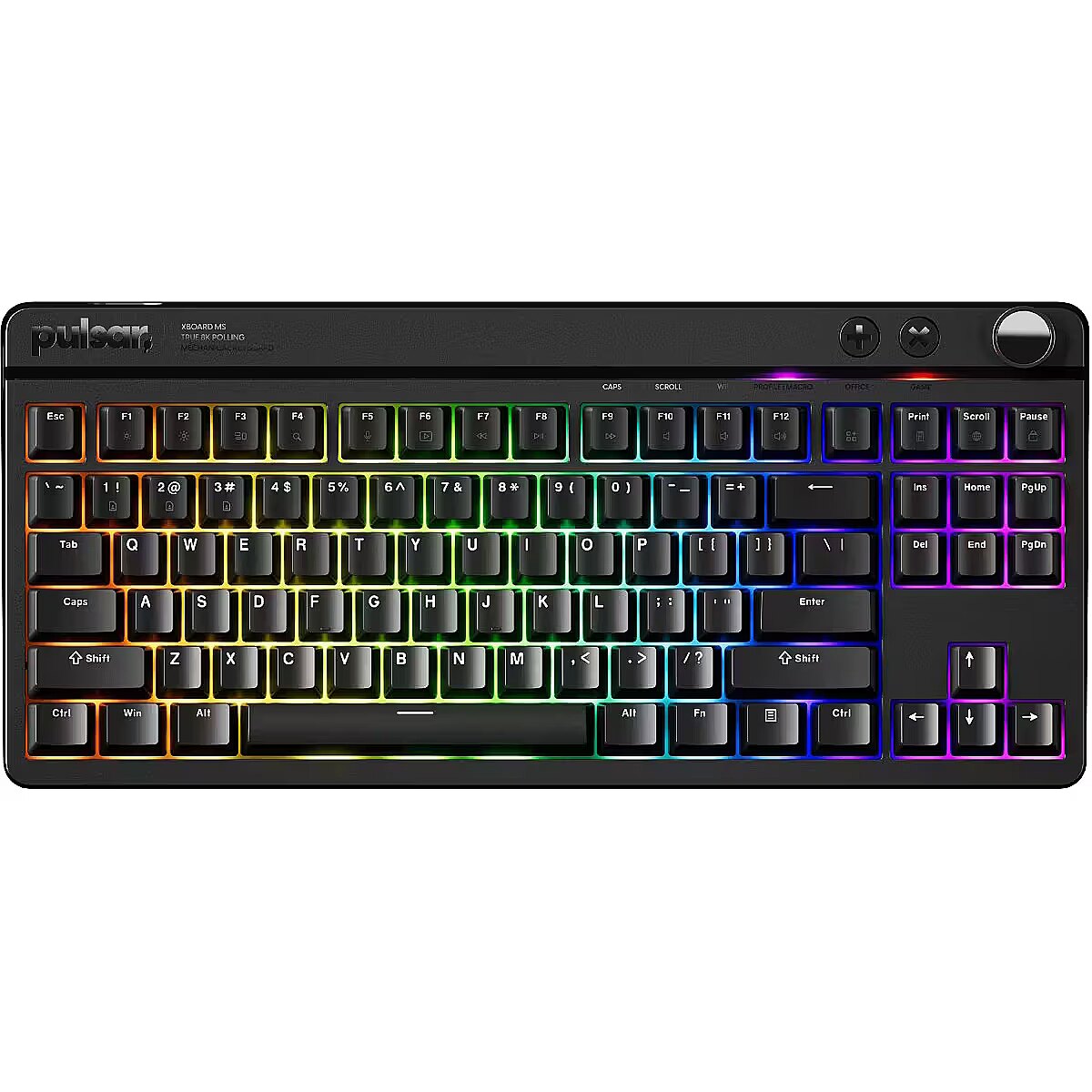 Summary - PULSAR XBOARD MS. Keyboard form factor: Tenkeyless (80 - 87%). Keyboard style: Straight. Connectivity technology: Wired, Device interface: USB, Keyboard key switch: Mechanical, Keyboard layout: QWERTY, Keyboard number of keys: 88. Backlight type: RGB LED. Recommended usage: Gaming. Product colour: Black