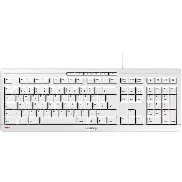 LongSummaryDescription - CHERRY STREAM. Keyboard form factor: Full-size (100%). Keyboard style: Straight. Connectivity technology: Wired, Device interface: USB, Keyboard key switch: Mechanical, Keyboard layout: QWERTY, Keyboard number of keys: 104. Cable length: 1.8 m. Recommended usage: Office. Product colour: White
