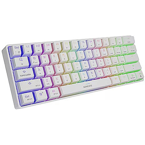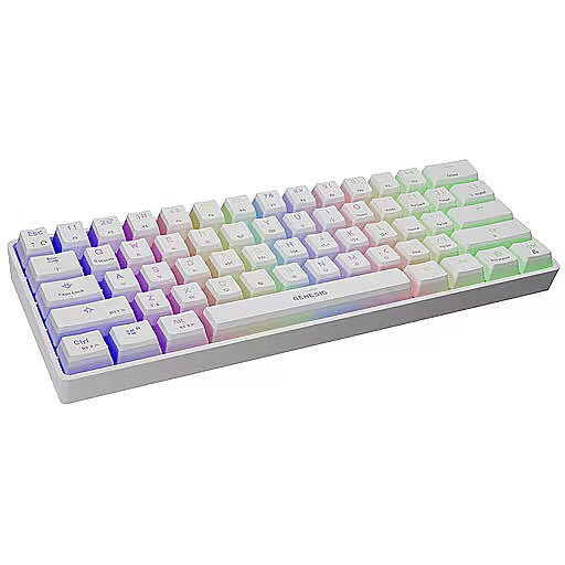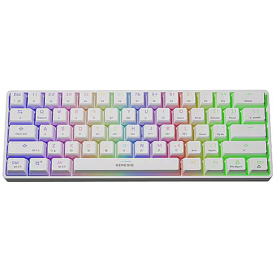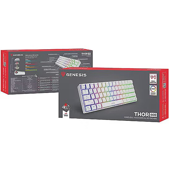 LongSummaryDescription - GENESIS Thor 660. Keyboard form factor: 60%. Keyboard style: Straight. Connectivity technology: Wired & Wireless, Device interface: USB + Bluetooth, Keyboard key switch: Mechanical, Keyboard layout: QWERTY, Keyboard number of keys: 61. Backlight type: RGB LED. Cable length: 1.5 m. Recommended usage: Gaming. Product colour: White