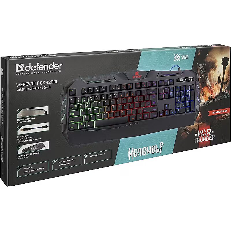 Description - Defender Werewolf GK-120DL Illuminated Gaming Keyboard Special gaming features: Windows system key lock and WASD toggle arrow keys* Recognises simultaneous key presses Rainbow backlighting Illuminated buttons and symbols Hot keys for office, multimedia and Internet applications Tilt angle of the keyboard is adjustable with the legs Adjustable backlight brightness Adjustable sample rate Metal bottom for increased durability Ferrite noise filter Braided cable structure Gold-plated USB connector Waterproof keyboard design Backlighting can be switched off Special gamer bonus - code for War Thunder game