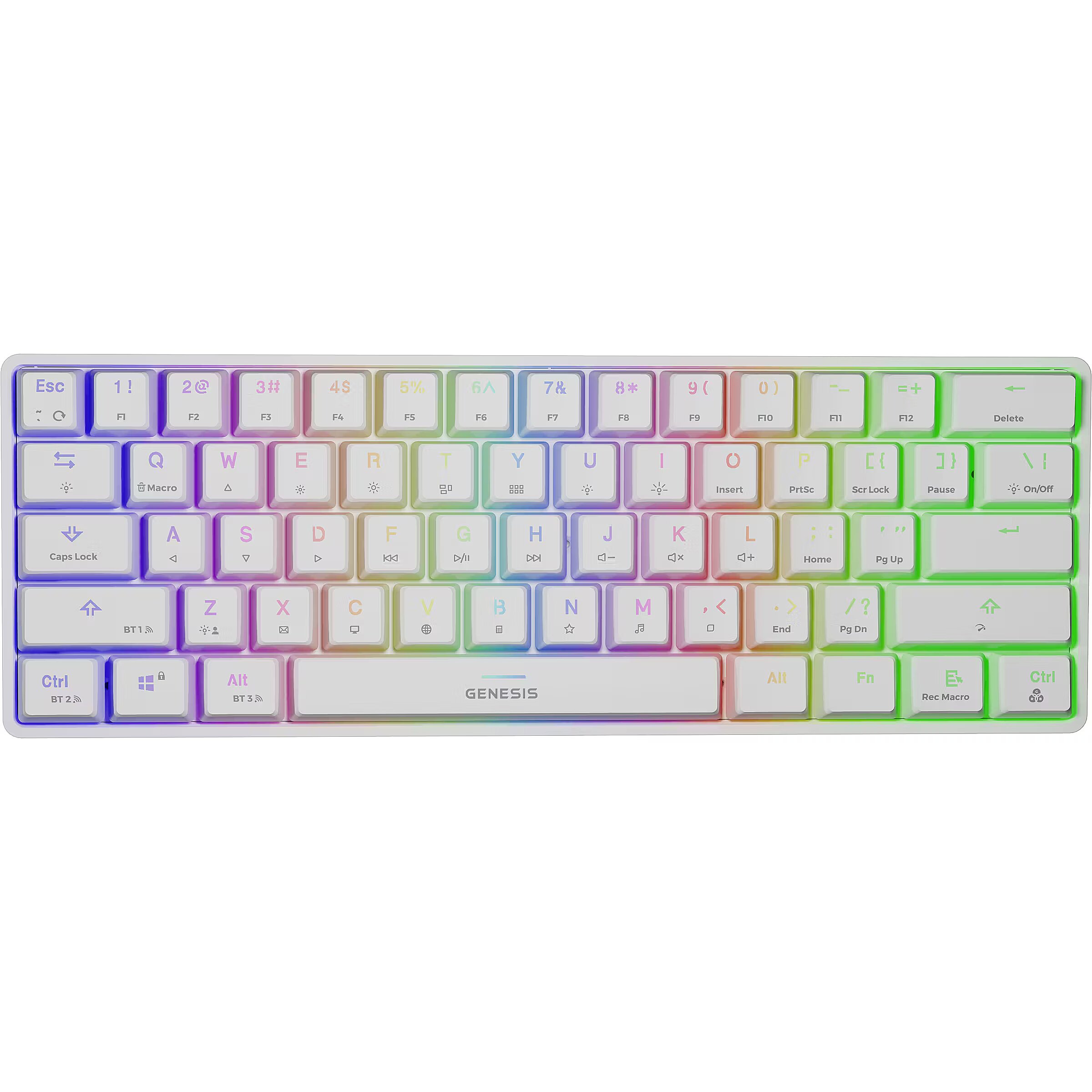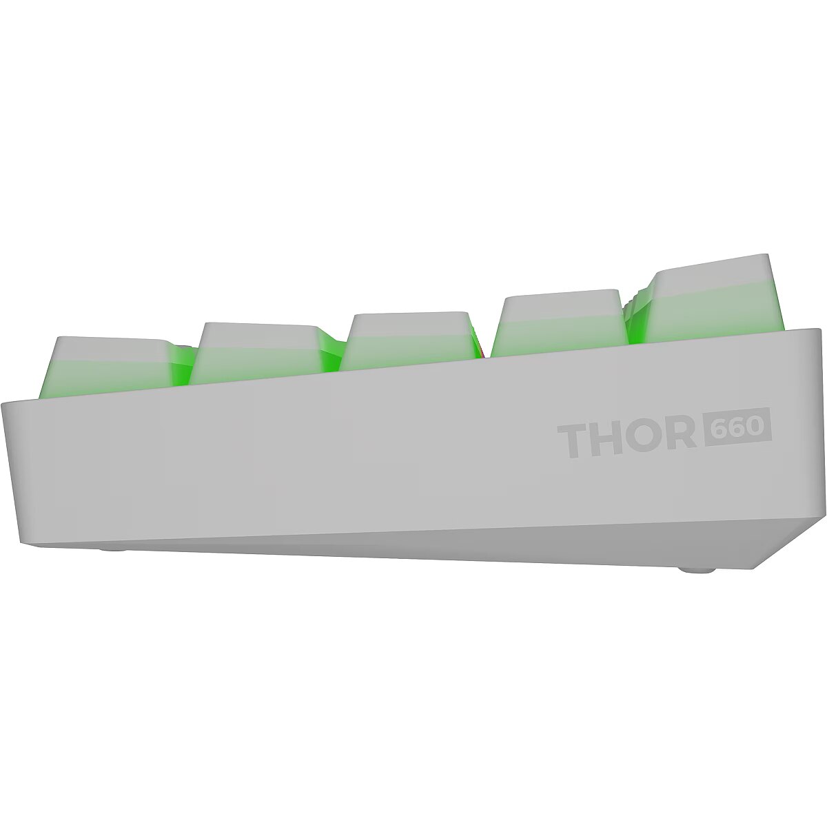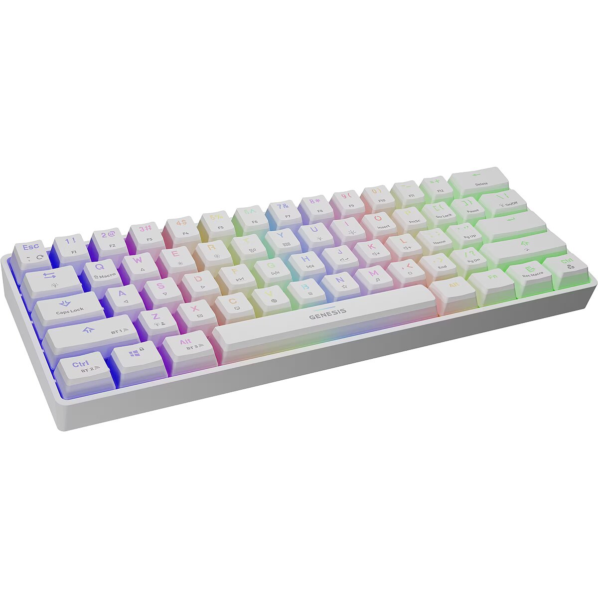 LongSummaryDescription - GENESIS Thor 660. Keyboard form factor: 60%. Keyboard style: Straight. Connectivity technology: Wired & Wireless, Device interface: USB + Bluetooth, Keyboard key switch: Mechanical, Keyboard layout: QWERTY, Keyboard number of keys: 61. Backlight type: RGB LED. Cable length: 1.5 m. Recommended usage: Gaming. Product colour: White